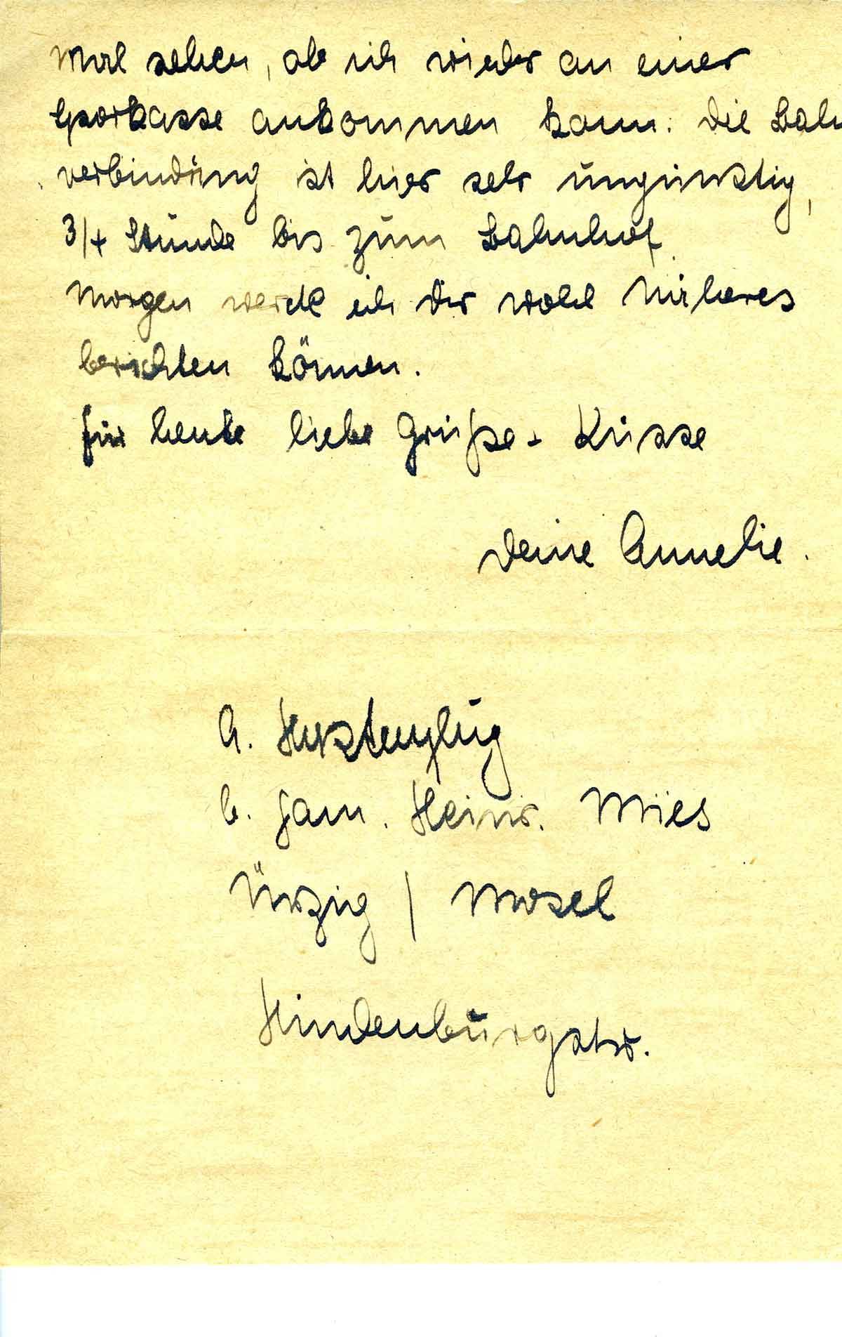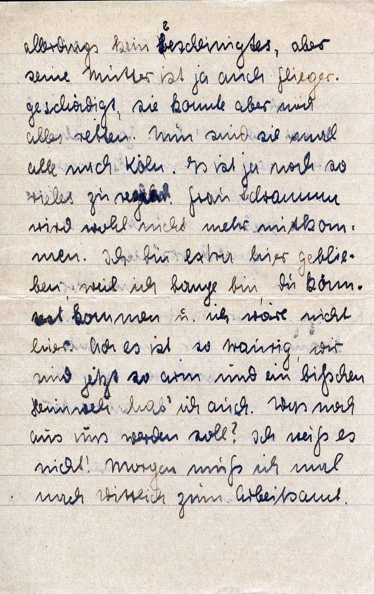 allerdings kein bescheinigtes, aber seine Mutter ist ja auch Fliegergeschädigt, sie konnte aber noch alles retten. Nun sind sie mal alle nach Köln. Es ist ja noch so vieles zu regeln. Frau Schramma wird wohl nicht mehr mitkommen. Ich bin extra hier geblieben, weil ich bange bin, Du könntest kommen u. ich wäre nicht hier. Ach es ist so traurig, wir sind jetzt so arm und ein bißchen Heimweh hab’ ich auch. Was noch aus uns werden soll? Ich weiß es nicht! Morgen muß ich mal nach Wittlich zum Arbeitsamt.