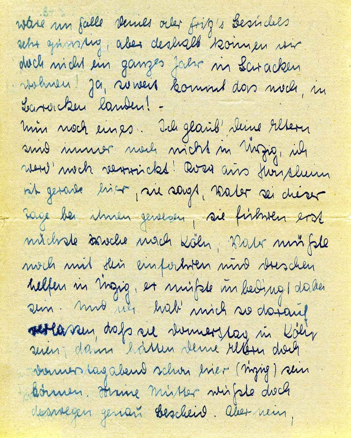 wäre im Falle Deines oder Fritz’s Besuches sehr günstig, aber deshalb können wir doch nicht ein ganzes Jahr in Baracken wohnen! Ja, soweit kommt das noch, in Baracken landen! -