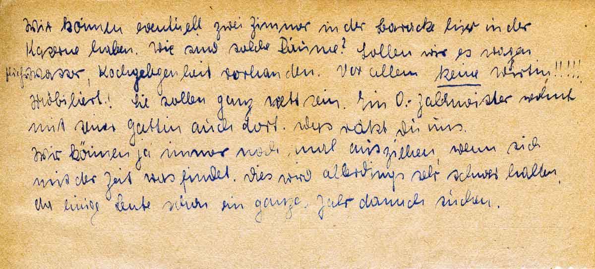 Wir können eventuell zwei Zimmer in der Baracke hier in der Kaserne haben. Wie sind solche Räume? Sollen wir es wagen, Fließwasser, Kochgelegenheit vorhanden. Vor allem keine Wirtin!!!!! Möbiliert! Sie sollen ganz nett sein. Ein O.-Zahlmeister wohnt mit seiner Gattin auch dort. Was rätst Du uns.