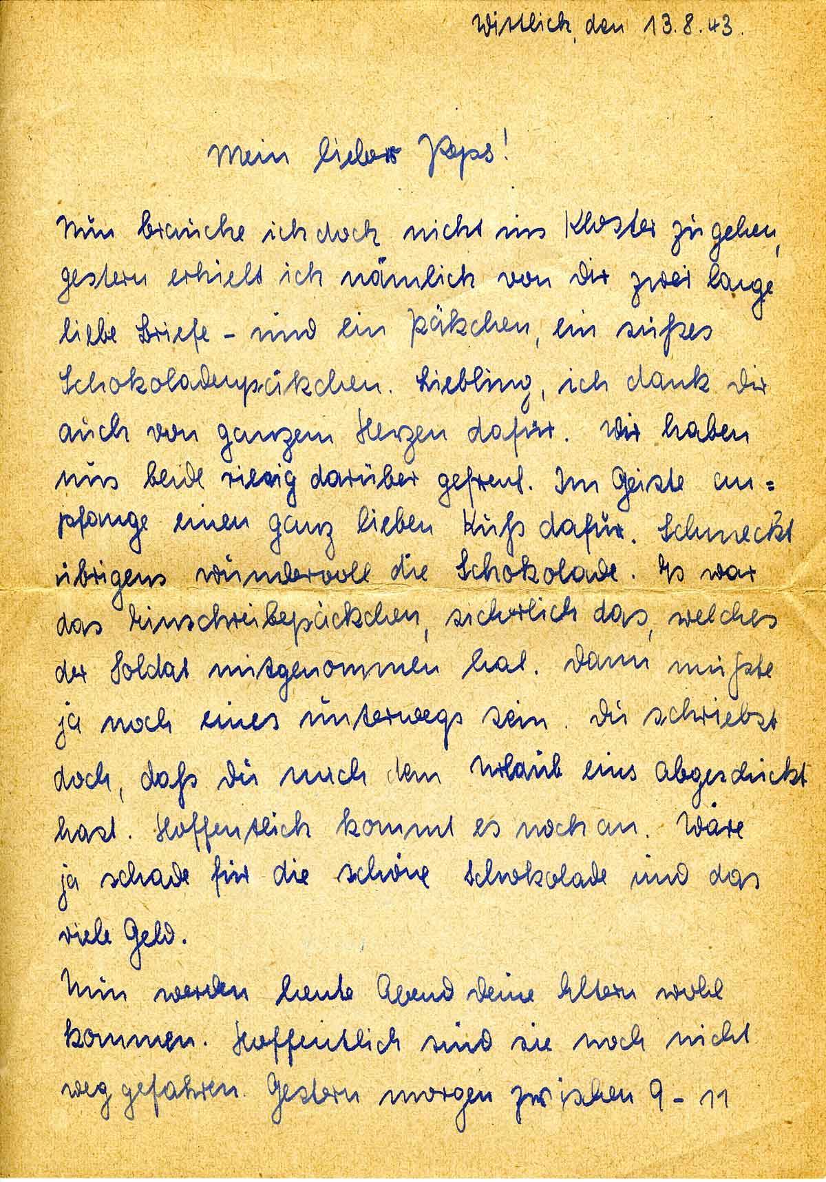 Nun brauche ich doch nicht ins Kloster zu gehen, gestern erhielt ich nämlich von Dir zwei lange liebe Briefe - und ein Päkchen[!], ein süßes Schokoladenpäkchen. Liebling, ich danke Dir auch von ganzem Herzen dafür. Wir haben uns beide riesig darüber gefreut. Im Geiste empfange einen ganz lieben Kuß dafür. Schmeckt übrigens wundervoll die Schokolade. Es war das Einschreibepäckchen, sicherlich das, welches der Soldat mitgenommen hat. Dann müßte ja noch eines unterwegs sein. Du schriebst doch, daß Du nach dem Urlaub eins abgeschickt hast. Hoffentlich kommt es noch an. Wäre ja schade für die schöne Schokolade und das viele Geld.