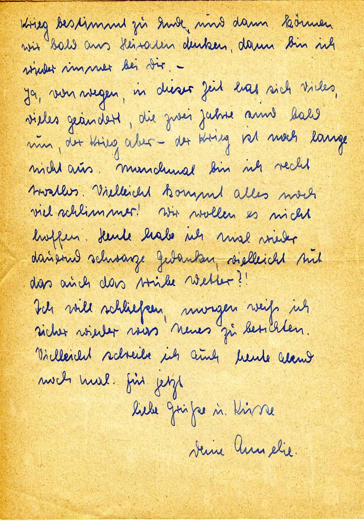 Ach Pepserl, wie lange wird der Krieg noch dauern?! Ach weißt Du, heute mußte ich an St. Wendel Weihnachten vor fast zwei Jahren denken. Ja, tatsächlich, bald werden es zwei Jahre, daß Du in den Arbeitsdienst kamst. Weißt Du, wir standen im Park. Du sagtest: in zwei Jahren sieht alles ganz anders aus, dann ist der
