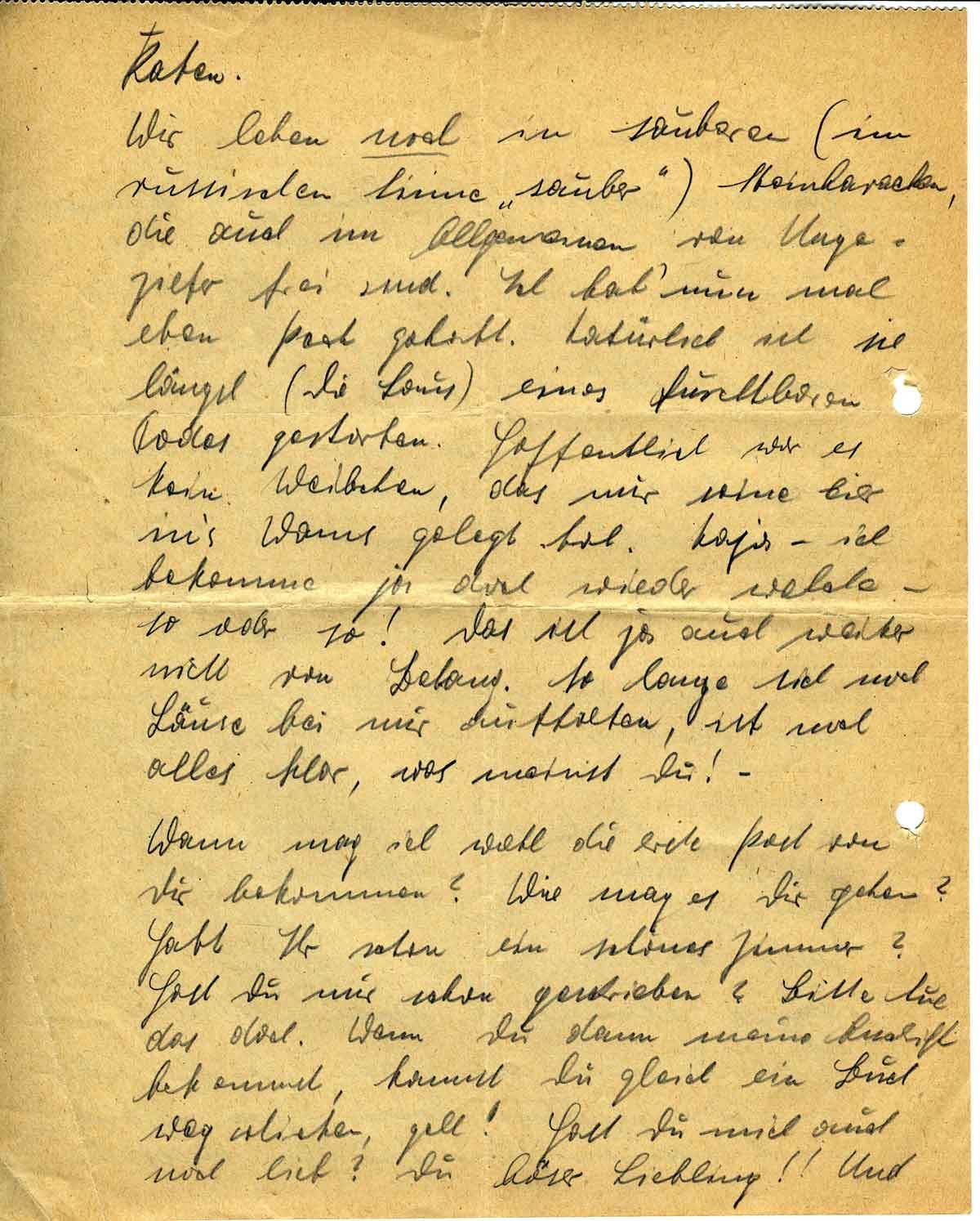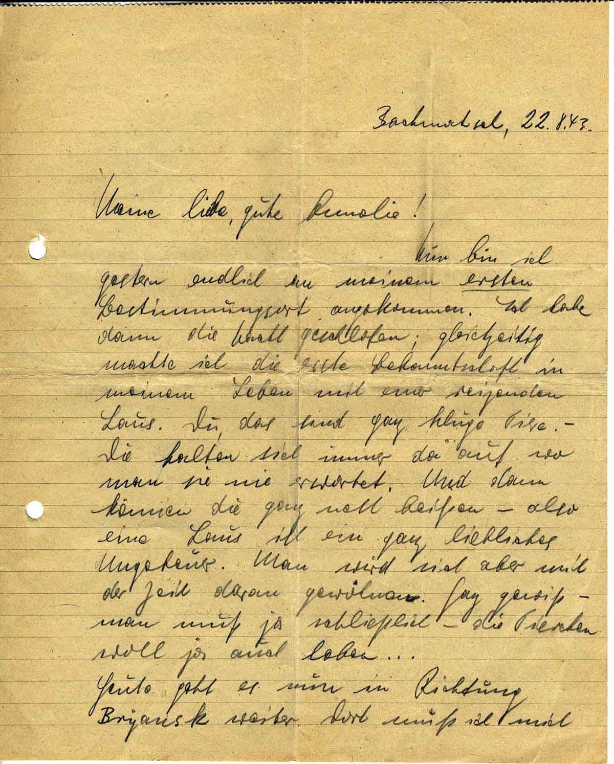 Nun bin ich gestern endlich an meinem ersten Bestimmungsort angekommen. Ich habe dann die Nacht geschlafen; gleichzeitig machte ich die erste Bekanntschaft in meinem Leben mit einer reizenden Laus. Du, das sind ganz kluge Tiere. - Die halten sich immer da auf wo man sie nie erwartet. Und dann können die ganz nett beißen - also eine Laus ist ein ganz liebliches Ungeheuer. Man wird sich aber mit der Zeit daran gewöhnen. Ganz gewiß - man muß ja schließlich - die Tierchen woll ja auch leben...