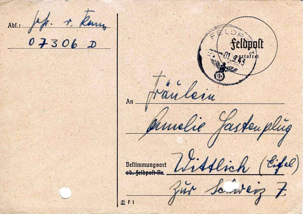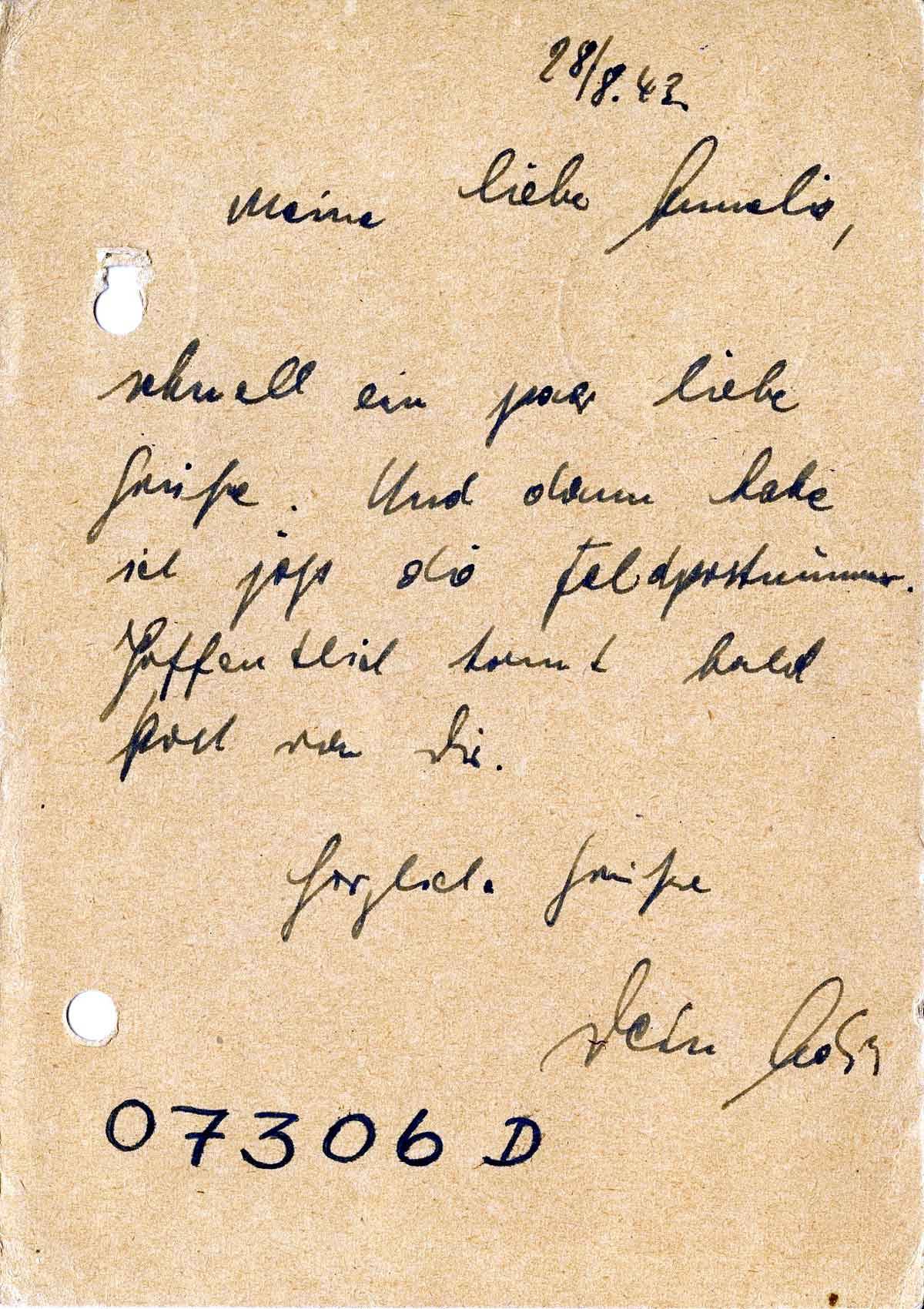 schnell ein paar liebe Grüße. Und dann habe ich jetzt die Feldpostnummer. Hoffentlich kommt bald Post von Dir.