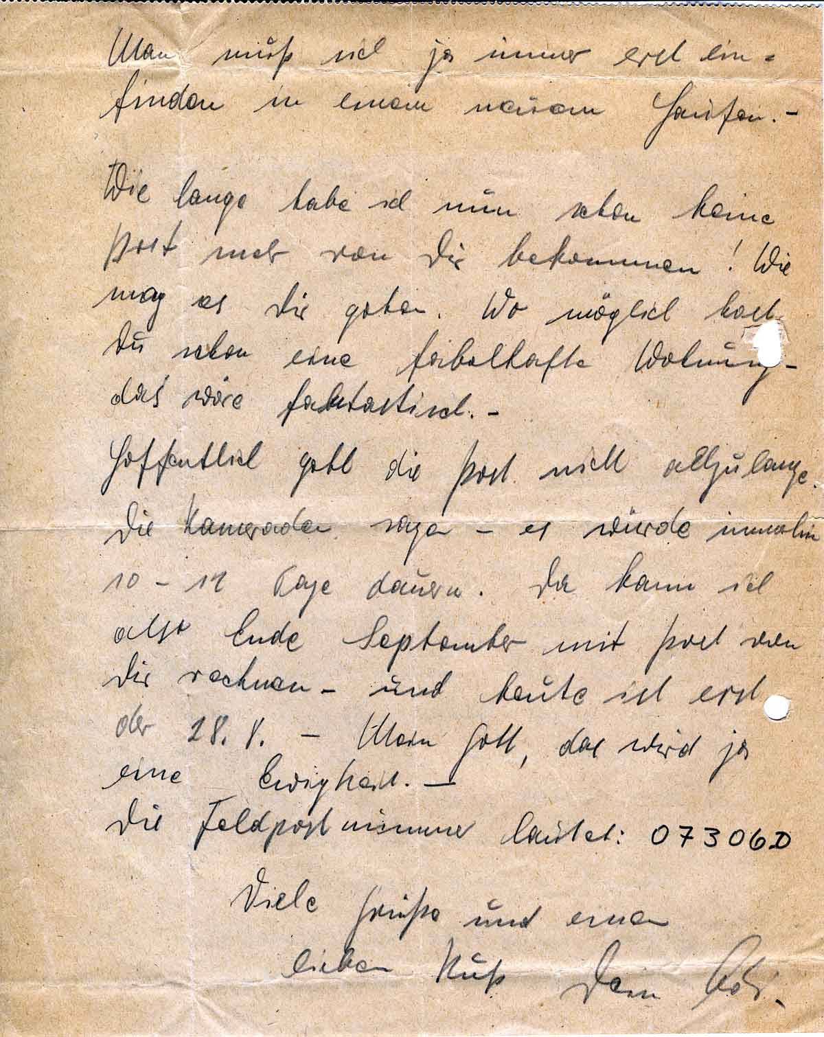 Hoffentlich geht die Post nicht allzulange. Die Kameraden sagen - es würde immerhin 10 - 12 Tage dauern. Da kann ich also Ende September mit Post von Dir rechnen - und heute ist erst der 28.8. - Mein Gott, das wird ja eine Ewigkeit. -