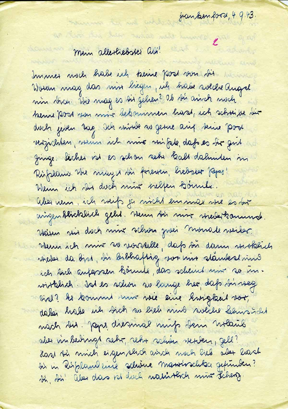 Immer noch habe ich keine Post von Dir. Woran mag das nur liegen, ich habe solche Angst um Dich. Wie mag es Dir gehen? Ob Du auch noch keine Post von mir bekommen hast, ich schreibe Dir doch jeden Tag. Ich würde so gerne auf Deine Post verzichten, wenn ich nur wüßte, daß es Dir gut ginge. Sicher ist es schon sehr kalt dahinten in Rußland. Wie magst Du frieren, liebster Peps! Wenn ich Dir doch nur helfen könnte.