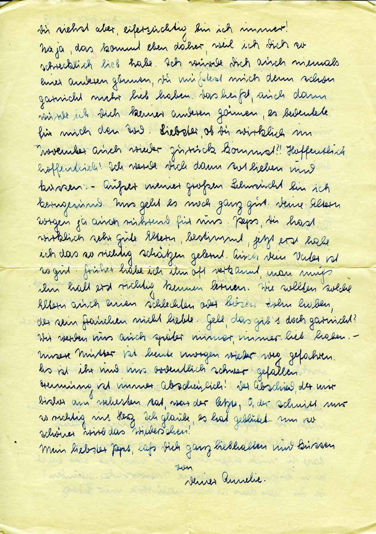 Na ja, das kommt eben daher, weil ich Dich so schrecklich lieb habe. Ich würde Dich auch niemals einer anderen gönnen, Du müßtest mich denn schon garnicht mehr lieb haben. Das heißt, auch dann würde ich Dich keiner anderen gönnen, es bedeutete für mich den Tod. Liebster, ob Du wirklich im November auch wieder zurück kommst?! Hoffentlich, hoffentlich! Ich werde Dich dann totlieben und küssen. - Außer meiner großen Sehnsucht bin ich kerngesund. Uns geht es noch ganz gut. Deine Eltern sorgen ja auch rührend für uns. Peps, Du hast wirklich sehr gute Eltern, bestimmt, jetzt erst habe ich das so richtig schätzen gelernt. Auch Dein Vater ist so gut. Früher habe ich ihn oft verkannt, man muß ihn halt erst richtig kennen lernen. Wie sollten solche Eltern auch einen schlechten oder bösen Sohn haben, der sein Frauchen nicht liebte. Gell, das gib’s doch garnicht? Wir werden uns auch später immer, immer lieb haben. - Unsere Mutter ist heute morgen wieder weg gefahren. Es ist ihr und uns ordentlich schwer gefallen.