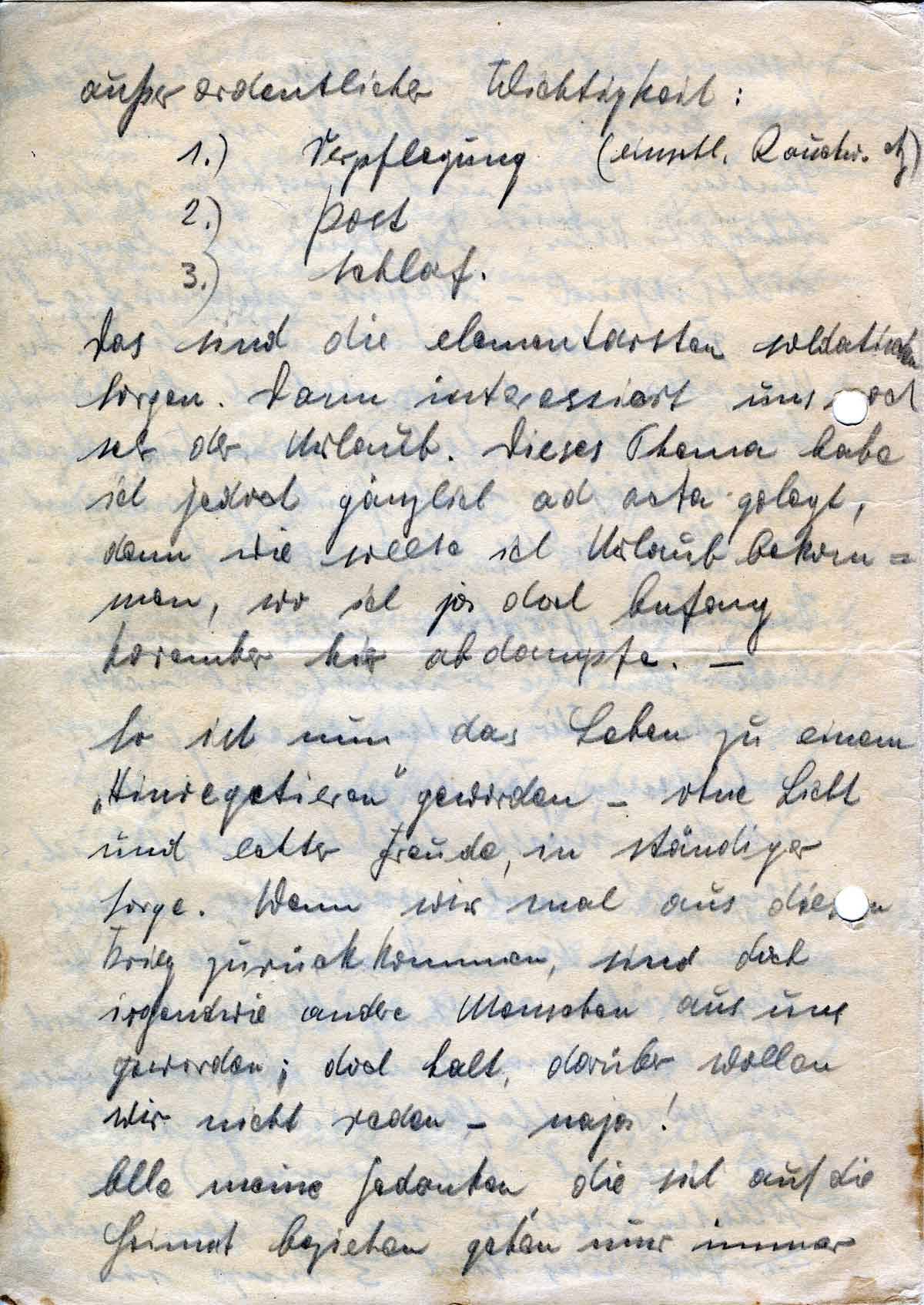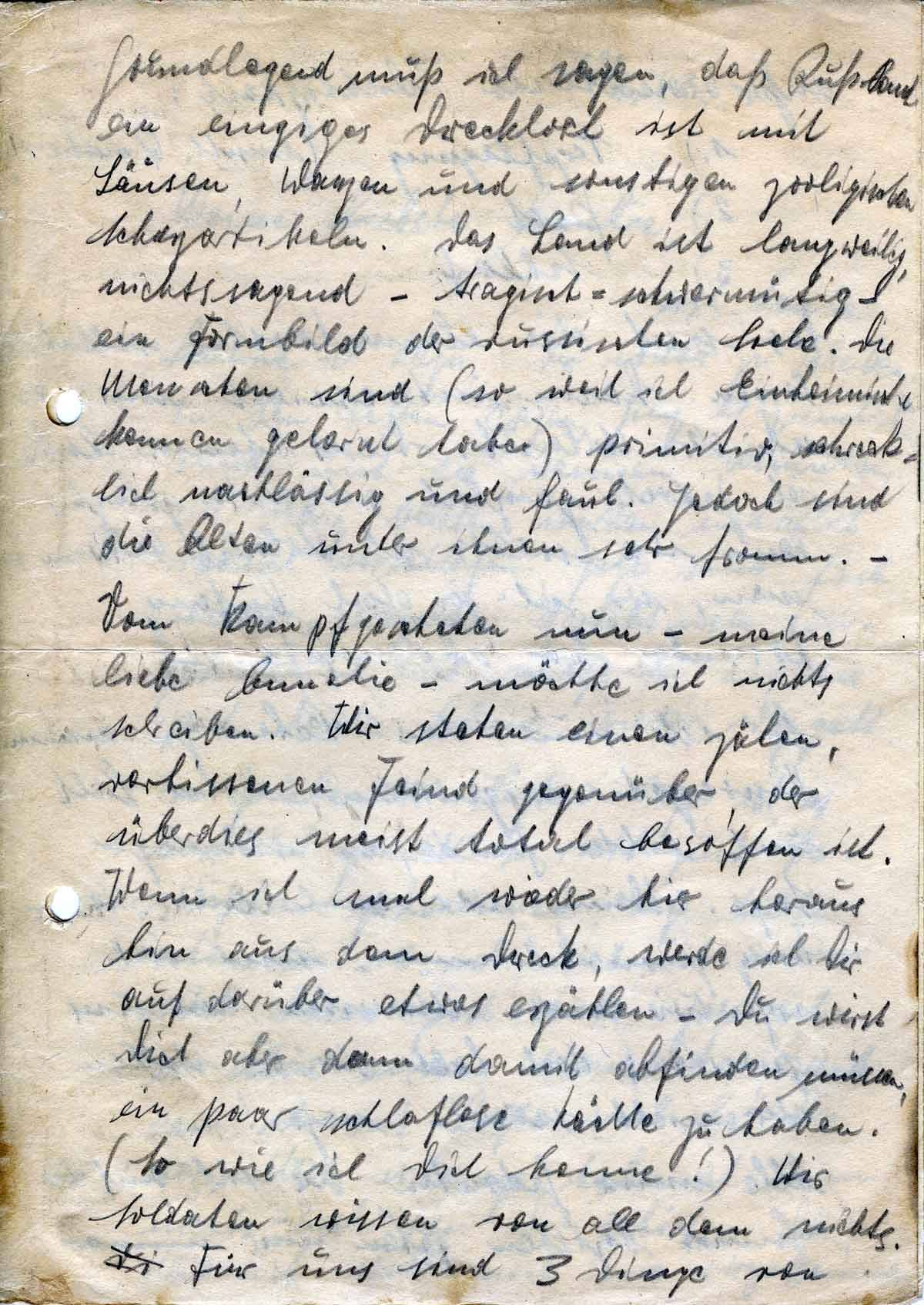 Vom Kampfgeschehen nun - meine liebe Annelie - möchte ich nichts schreiben. Wir stehen einem zähen, verbissenen Feind gegenüber, der überdies meist total besoffen ist. Wenn ich mal wieder hier heraus bin aus dem Dreck, werde ich Dir auch darüber etwas erzählen - Du wirst Dich aber dann damit abfinden müssen, ein paar schlaflose Nächte zu haben. (So wie ich Dich kenne!) Wir Soldaten wissen von all dem nichts. Für uns sind 3 Dinge von