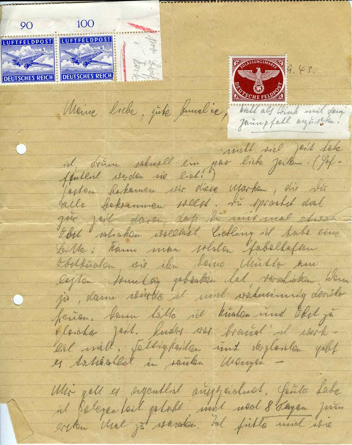 Gestern bekamen wir diese Marken, die Du alle bekommen sollst. Du sprachst doch zur Zeit davon, daß Du mir mal etwas Obst schicken wolltest. Liebling, ich habe eine Bitte: Kann man solchen fabelhaften Obstkuchen, wie ihn Deine Mutter am letzten Sonntag gebacken hat, verschicken. Wenn ja, dann würde ich mich wahnsinnig darüber freuen. Dann hätte ich Kuchen und Obst zu gleicher Zeit. Anders was brauch’ ich wirklich nicht. Fettigkeiten und dergleichen gibt es tatsächlich in rauhen Mengen. -
