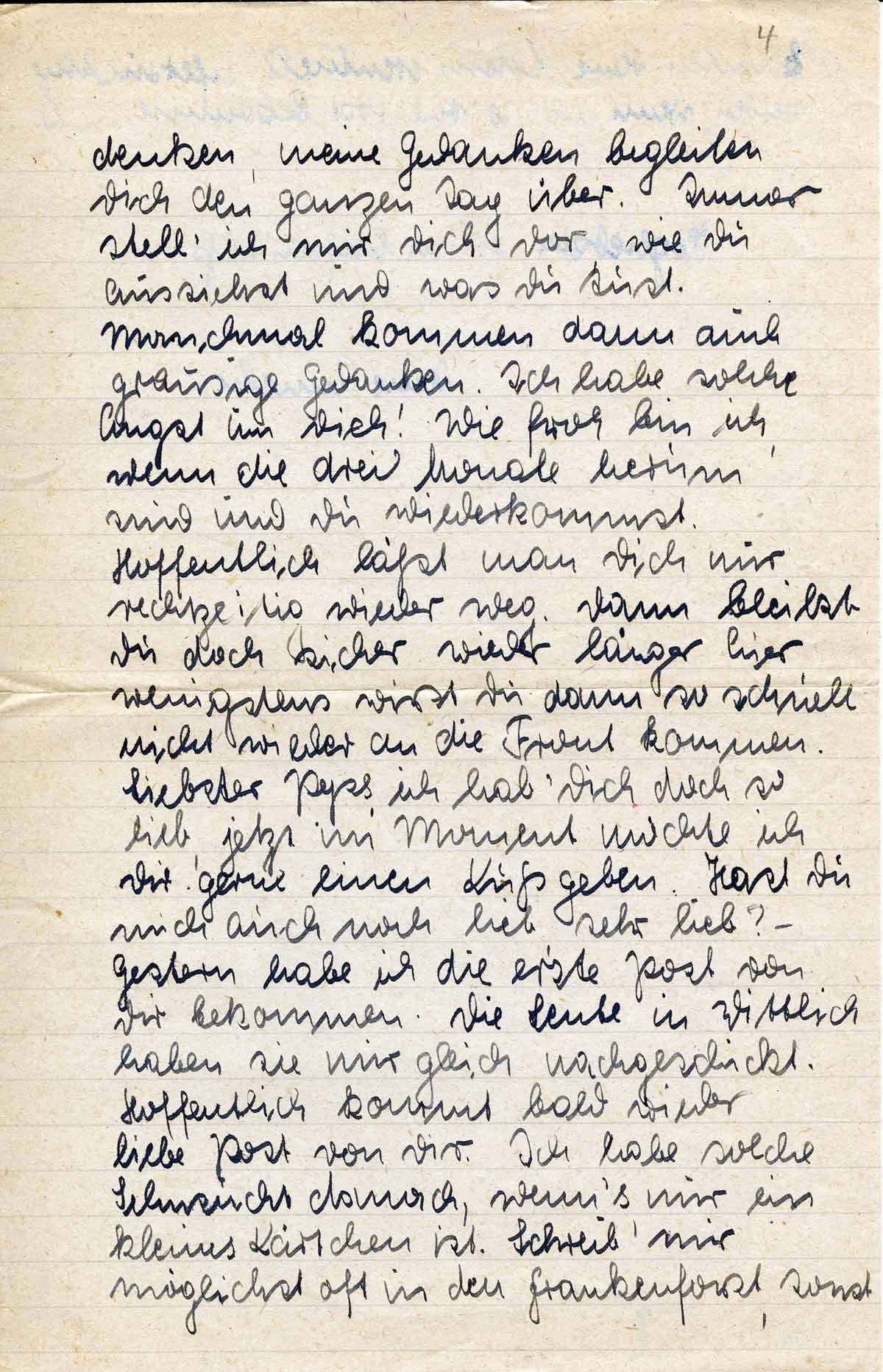 Hoffentlich läßt man Dich nur rechtzeitig wieder weg. Dann bleibst Du doch sicher wieder länger hier, wenigstens wirst Du dann so schnell nicht wieder an die Front kommen. Liebster Peps, ich hab’ Dich doch so lieb, jetzt im Moment möchte ich Dir gerne einen Kuß geben. Hast Du mich auch noch lieb, sehr lieb? - Gestern habe ich die erste Post von Dir bekommen. Die Leute in Wittlich haben sie mir gleich nachgeschickt. Hoffentlich kommt bald wieder liebe Post von Dir. Ich habe solche Sehnsucht danach, wenn’s nur ein kleines Kärtchen ist. Schreib’ mir möglichst oft in den Frankenforst, sonst