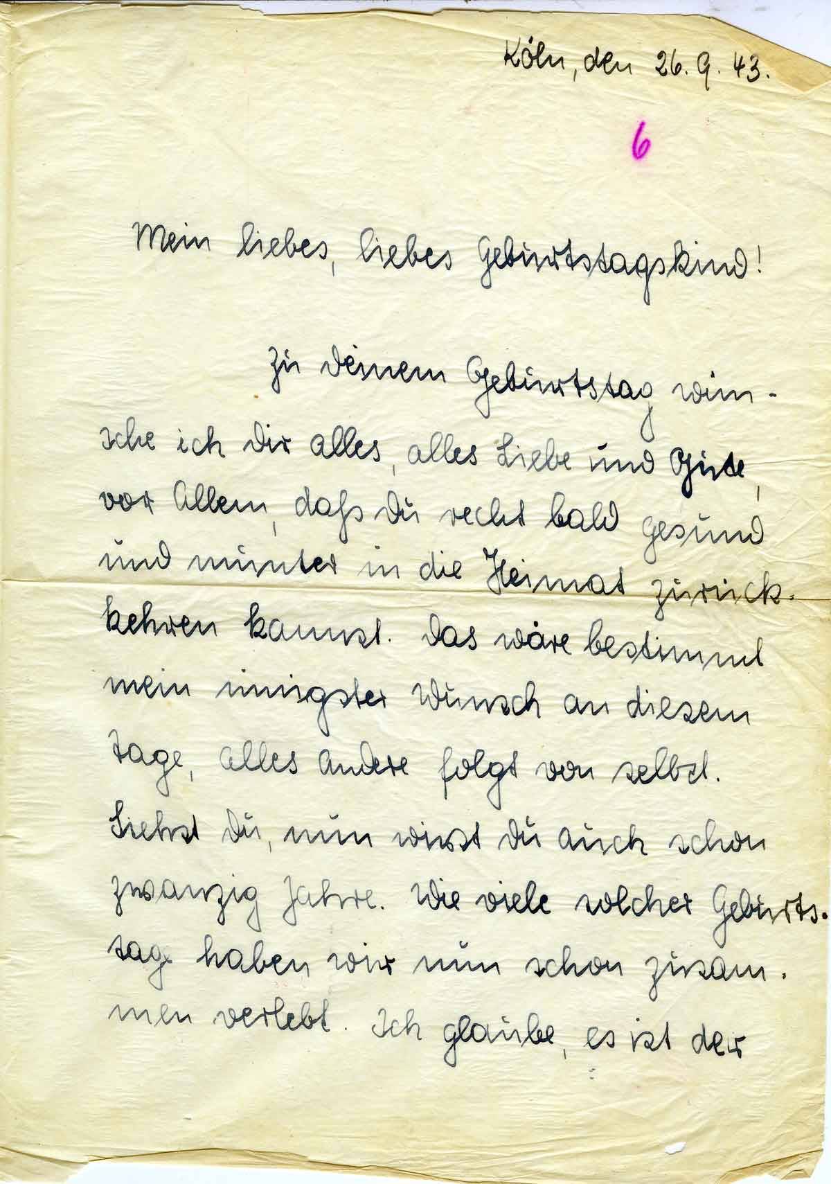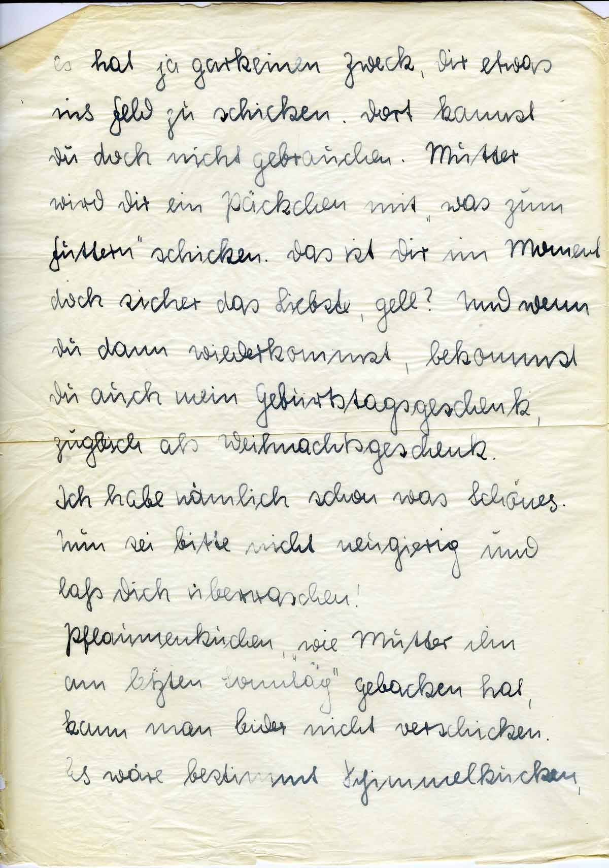 es hat ja garkeinen Zweck, Dir etwas ins Feld zu schicken. Dort kannst Du doch nicht gebrauchen. Mutter wird Dir ein Päckchen mit „was zum Futtern“ schicken. Das ist Dir im Moment doch sicher das Liebste, gell? Und wenn Du dann wiederkommst, bekommst Du auch mein Geburtstagsgeschenk, zugleich als Weihnachtsgeschenk. Ich habe nämlich schon was Schönes. Nun sei bitte nicht neugierig und laß Dich überraschen!