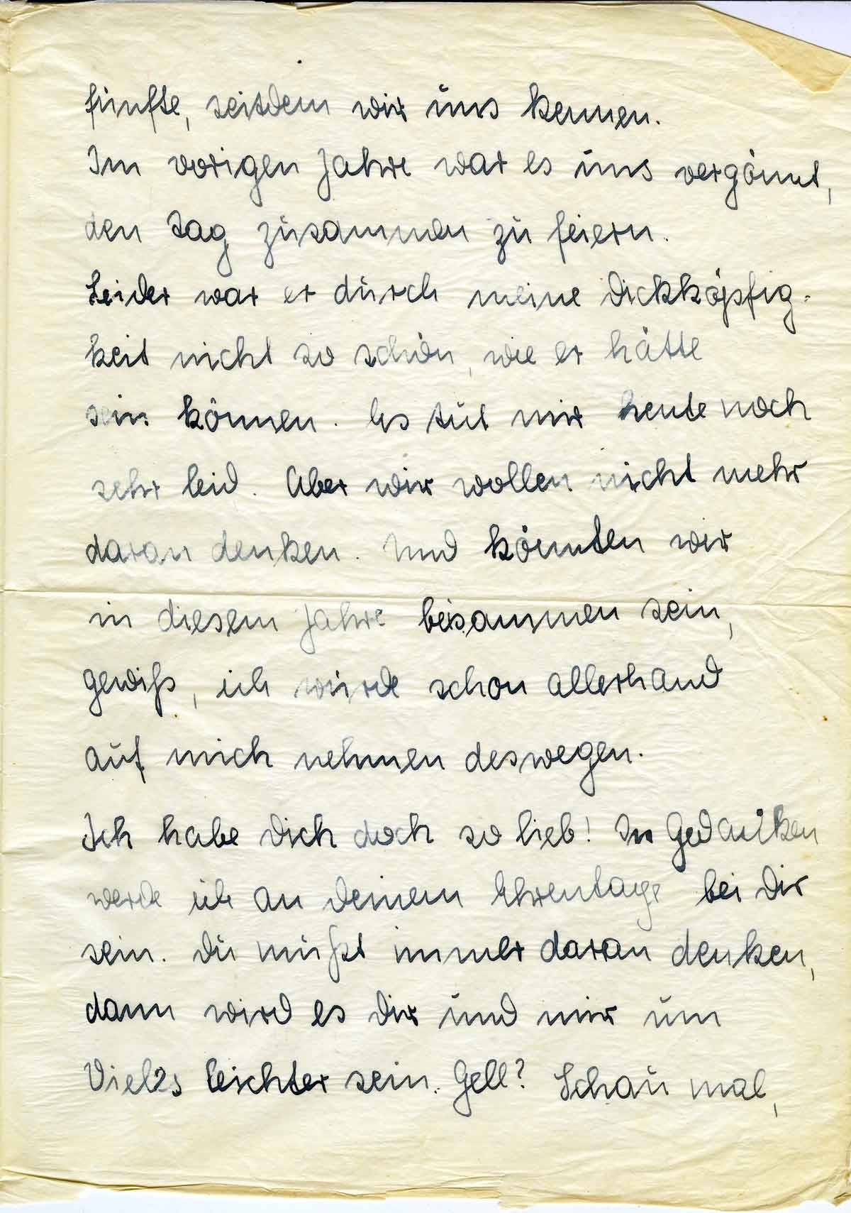 Ich habe Dich doch so lieb! In Gedanken werde ich an Deinem Ehrentage bei Dir sein. Du mußt immer daran denken, dann wird es Dir und mir um Vieles leichter sein. Gell? Schau mal,