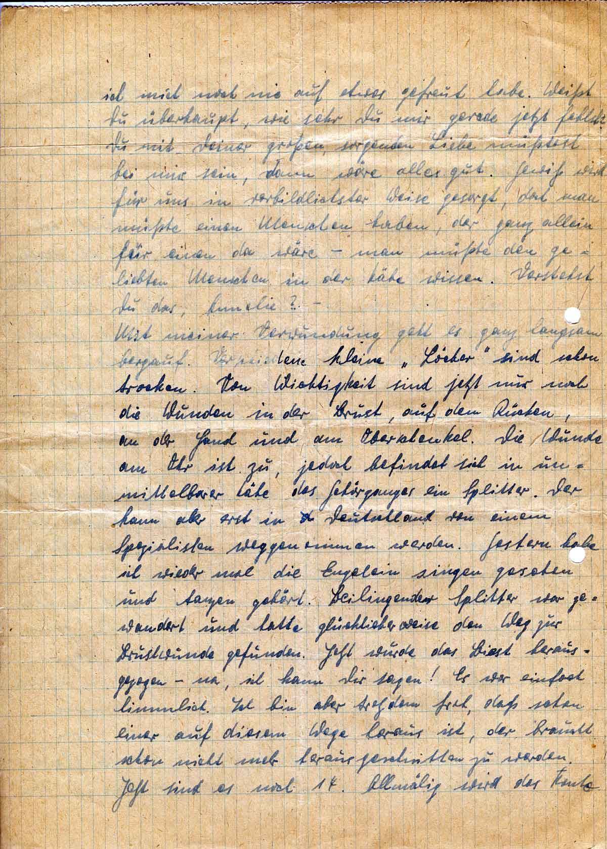 Mit meiner Verwundung geht es ganz langsam bergauf. Verschiedene kleine „Löcher“ sind schon trocken. Von Wichtigkeit sind jetzt nur noch die Wunden in der Brust, auf dem Rücken, an der Hand und am Oberschenkel. Die Wunde am Ohr ist zu, jedoch befindet sich in unmittelbarer Nähe des Gehörganges ein Splitter. Der kann aber erst in Deutschland von einem Spezialisten weggenommen werden. Gestern habe ich wieder mal die Engelein singen gesehen und tanzen gehört. Beiliegender Splitter war gewandert und hatte glücklicherweise den Weg zur Brustwunde gefunden. Jetzt wurde das Biest herausgezogen - na, ich kann Dir sagen! Es war einfach himmlich. Ich bin aber trotzdem froh, daß schon einer auf diesem Wege heraus ist, der braucht schon nicht mehr herausgeschnitten zu werden. Jetzt sind es noch 14. Allmälig wird das Konto