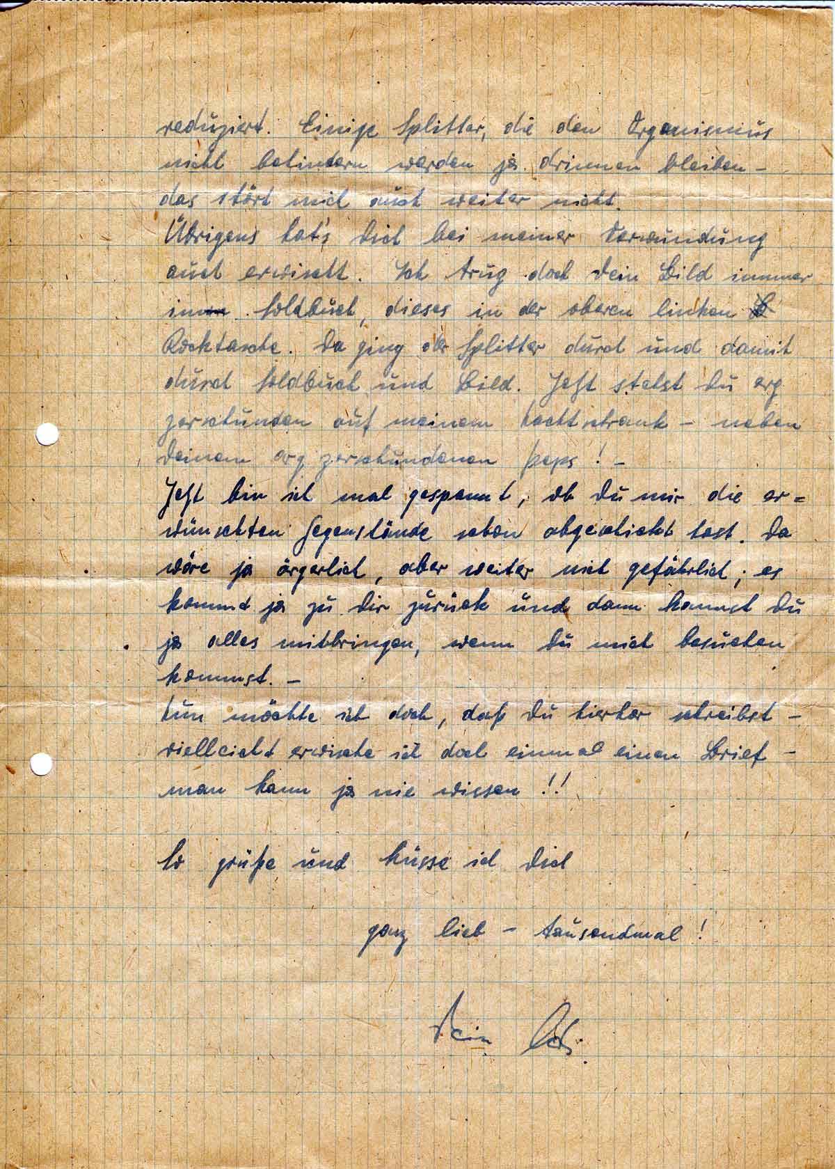 Übrigens hat’s Dich bei meiner Verwundung auch erwischt. Ich trug doch Dein Bild immer im Soldbuch, dieses in der oberen linken Rocktasche. Da ging der Splitter durch und damit durch Soldbuch und Bild. Jetzt stehst Du arg geschunden auf meinem Nachtschrank - neben Deinem arg zerschundenen Peps! -
