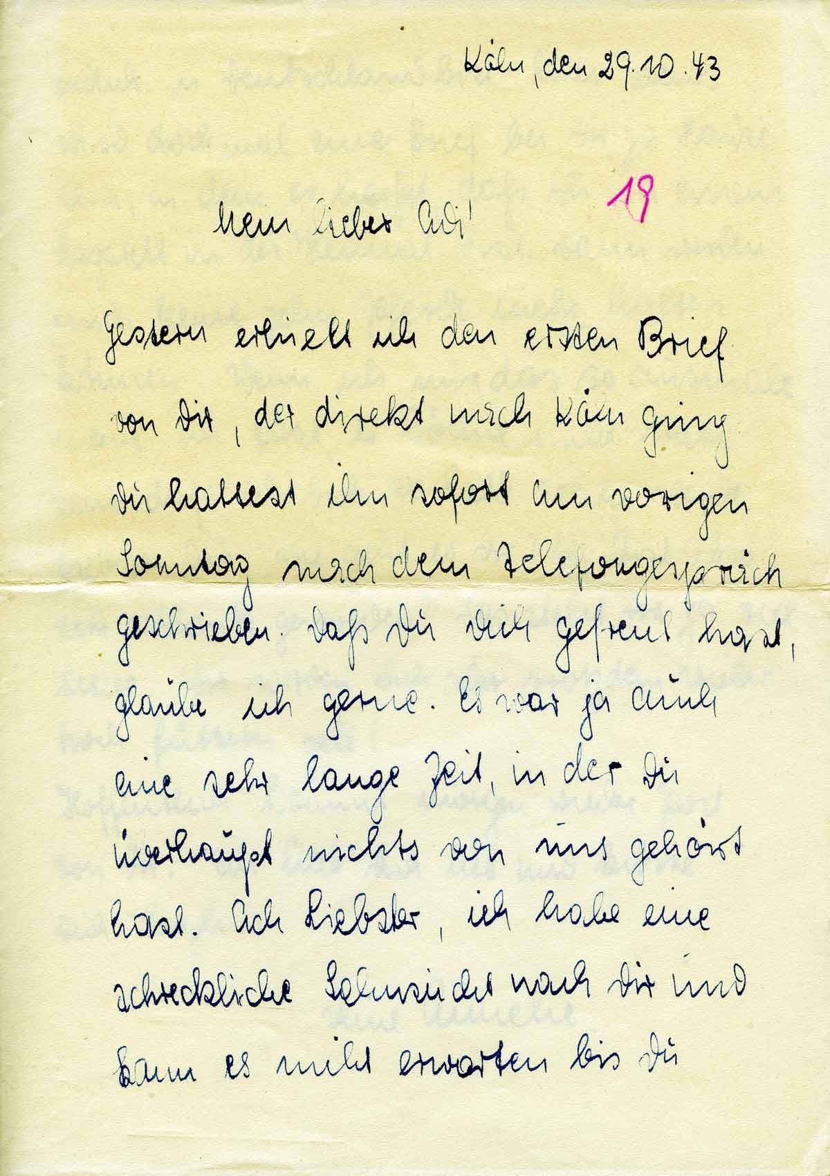Gestern erhielt ich den ersten Brief von Dir, der direkt nach Köln ging. Du hattest ihn sofort am vorigen Sonntag nach dem Telefongespräch geschrieben. Daß Du Dich gefreut hast, glaube ich gerne. Es war ja auch eine sehr lange Zeit, in der Du überhaupt nichts von uns gehört hast. Ach Liebster, ich habe eine schreckliche Sehnsucht nach Dir und kann es nicht erwarten bis Du