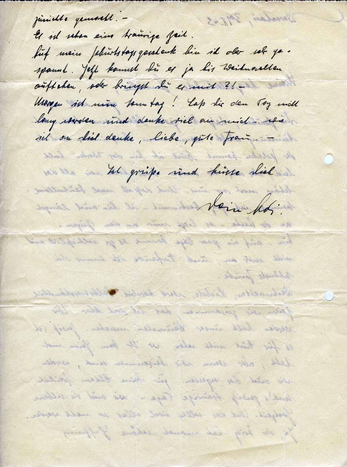 Weihnachten, Liebste, wird herrlich. Selbstverständlich feiern wir zusammen, das ist doch klar. Wir werden halt unser Bäumchen machen. Gewiß ist es für Euch nicht schön, wo Ihr kein Heim mehr habt, aber wenn wir beisammen sind, werden wir auch das vergessen. Für Deine Eltern freilich sind’s gewiß traurige Tage - wie auch die silberne Hochzeit. Und das sollte doch alles so nett werden. Ja, der Krieg hat manch schöne Hoffnung