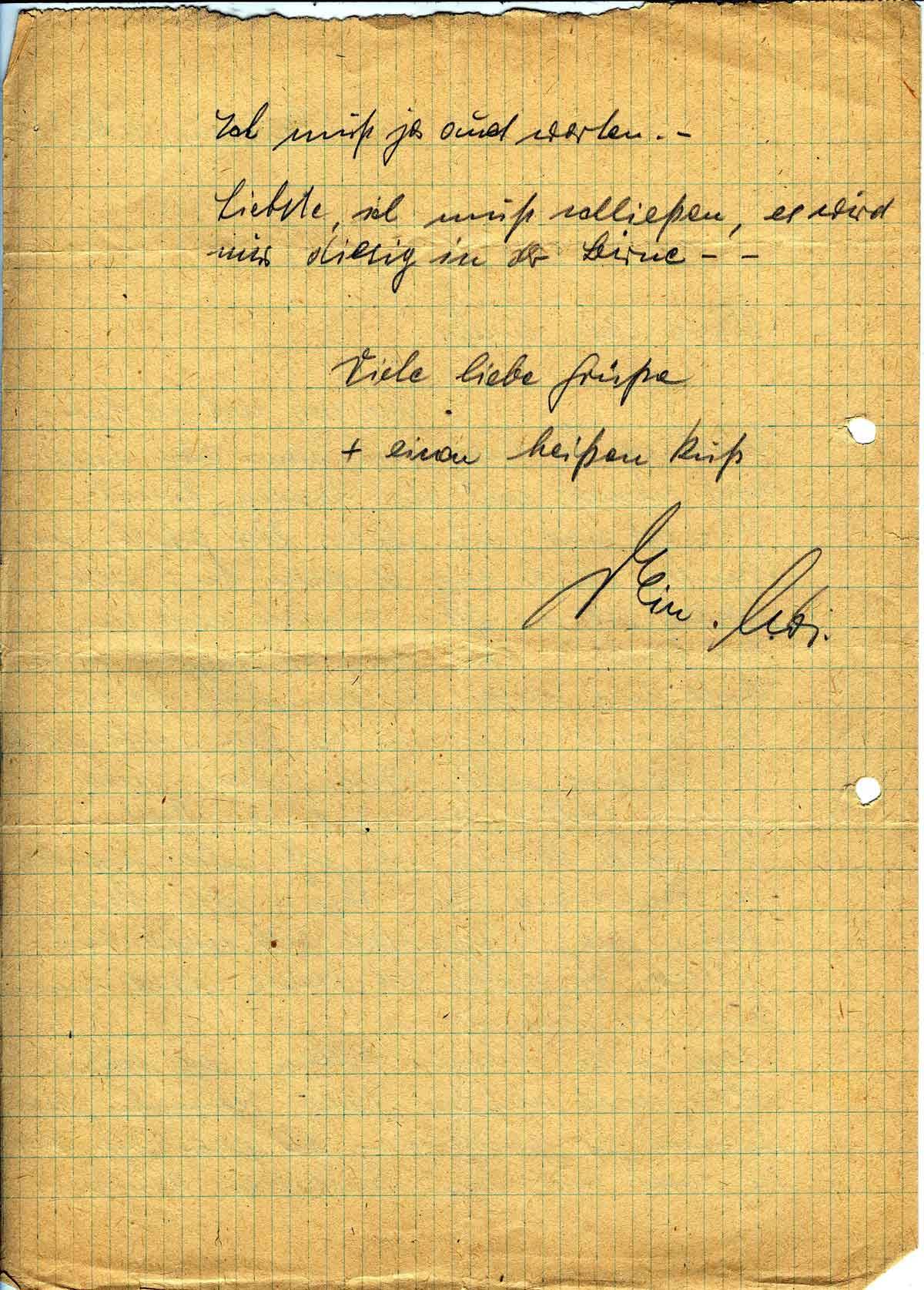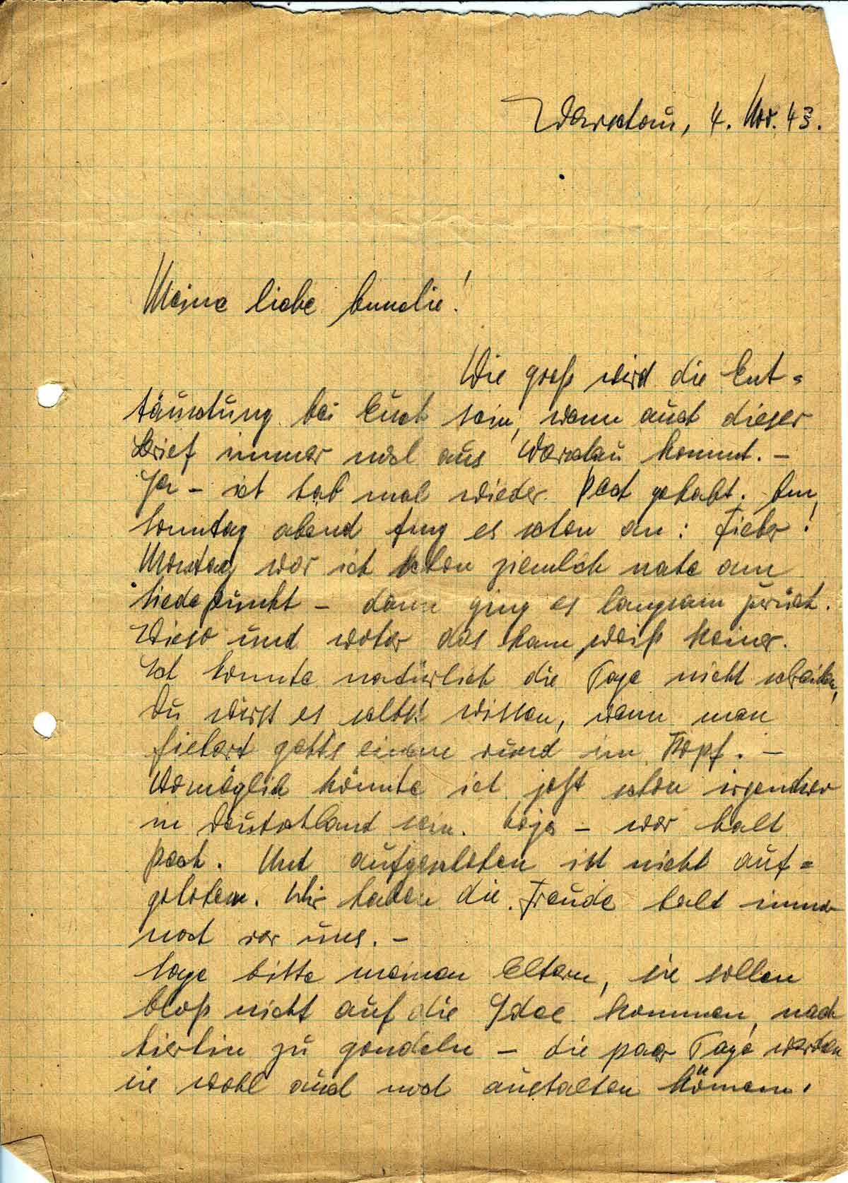 Wie groß wird die Enttäuschung bei Euch sein, wenn auch dieser Brief immer noch aus Warschau kommt. - Ja - ich hab mal wieder Pech gehabt. Am Sonntag abend fing es schon an: Fieber! Montag war ich schon ziemlich nahe am Siedepunkt - dann ging es langsam zurück. Wieso und woher das kam, weiß keiner. Ich konnte natürlich die Tage nicht schreiben, Du wirst es selbst wissen, wenn man fiebert geht’s einem rund im Kopf. - Womöglich könnte ich jetzt schon irgendwo in Deutschland sein. Naja - war halt Pech. Und aufgeschoben ist nicht aufgehoben. Wir haben die Freude halt immernoch vor uns. -