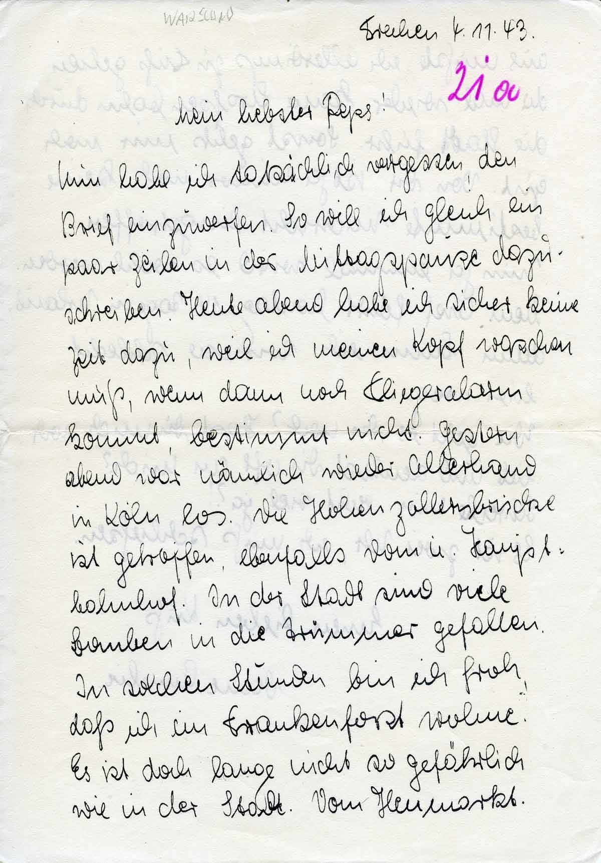 Nun habe ich tatsächlich vergessen, den Brief einzuwerfen. So will ich gleich ein paar Zeilen in der Mittagspause dazuschreiben. Heute abend habe ich sicher keine Zeit dazu, weil ich meinen Kopf waschen muß, wenn dann noch Fliegeralarm kommt, bestimmt nicht. Gestern abend war nämlich wieder allerhand in Köln los. Die Hohenzollernbrücke ist getroffen, ebenfalls Dom u. Hauptbahnhof. In der Stadt sind viele Bomben in die Trümmer gefallen. In solchen Stunden bin ich froh, daß ich im Frankenforst wohne. Es ist doch lange nicht so gefährlich wie in der Stadt. Vom Heumarkt