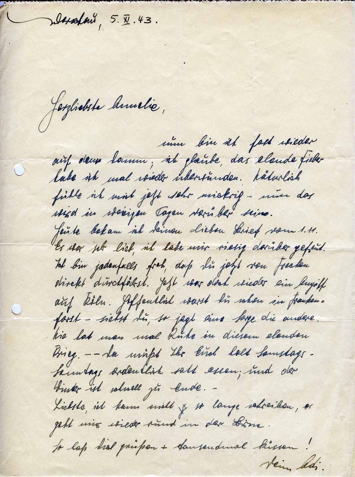 Heute bekam ich Deinen lieben Brief vom 1.11. Er war sehr lieb, ich habe mir riesig darüber gefreut. Ich bin jedenfalls froh, daß Du jetzt von Frechen direkt durchfährst. Jetzt war doch wieder ein Angriff auf Köln. Hoffentlich warst Du schon in Frankenforst - siehst Du, so jagt eine Sorge die andere. Nie hat man mal Ruhe in diesem elenden Krieg. - - Da müßt Ihr Euch halt Samstags - Sonntags ordentlich satt essen; und der Winter ist schnell zu Ende. -