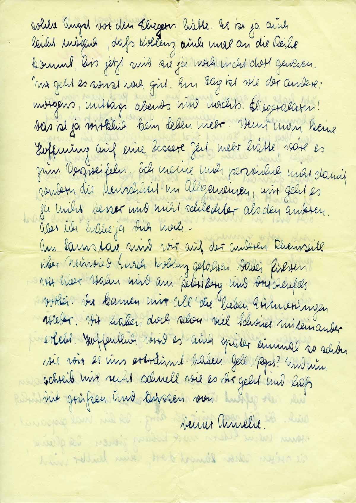 solche Angst vor den Fliegern hätte. Es ist ja auch leicht möglich, daß Koblenz auch mal an die Reihe kommt, bis jetzt sind sie ja noch nicht dort gewesen. Mir geht es sonst noch gut. Ein Tag ist wie der andere: morgens, mittags, abends und nachts: Fliegeralarm! Das ist ja wirklich kein Leben mehr. Wenn man keine Hoffnung auf eine bessere Zeit mehr hätte, wäre es zum Verzweifeln. Ich meine mich persönlich nicht damit, sondern die Menschheit im Allgemeinen, mir geht es ja nicht besser und nicht schlechter als den anderen. Aber ich habe ja Dich noch. -