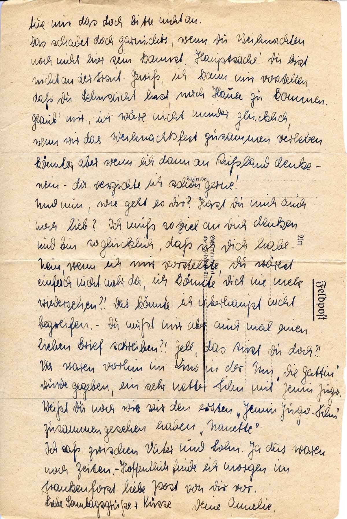 Das schadet doch garnichts, wenn Du Weihnachten noch nicht hier sein kannst. Hauptsache! Du bist nicht an der Front. Gewiß, ich kann mir vorstellen, daß Du Sehnsucht hast, nach Hause zu kommen. Glaub’ mir, ich wäre nicht minder glücklich, wenn wir das Weihnachtsfest zusammen verleben könnten, aber wenn ich dann an Rußland denke - nein - da verzichte ich schon gerne!