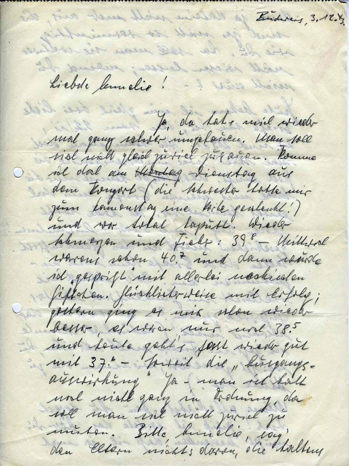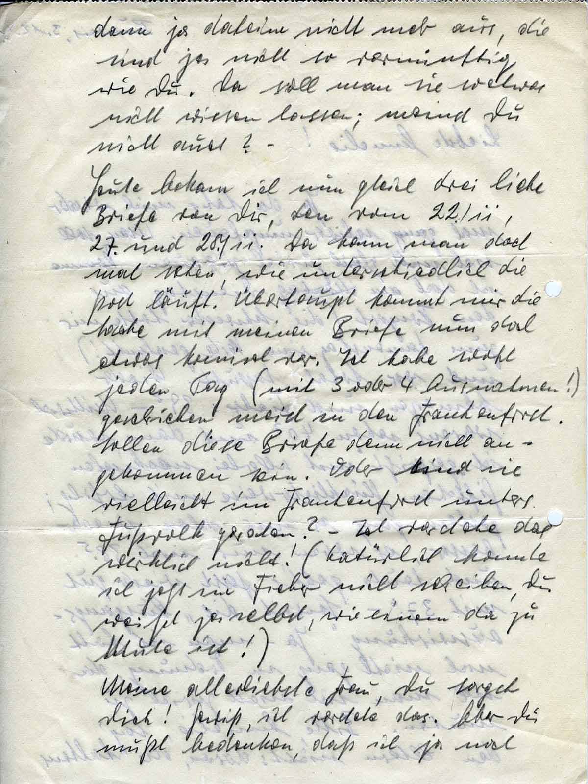 Heute bekam ich nun gleich drei liebe Briefe von Dir, den vom 22/11., 27. und 28/11. Da kann man doch mal sehen, wie unterschiedlich die Post läuft. Überhaupt kommt mir die Sache mit meinen Briefe nun doch etwas komisch vor. Ich habe wohl jeden Tag (mit 3 oder 4 Ausnahmen!) geschrieben, meist in den Frankenforst. Sollen diese Briefe denn nicht angekommen sein. Oder sind sie vielleicht im Frankenforst unters Fußvolk geraten? - Ich verstehe das wirklich nicht! (Natürlich konnte ich jetzt im Fieber nicht schreiben, Du weißt ja selbst, wie einem da zu Mute ist!)