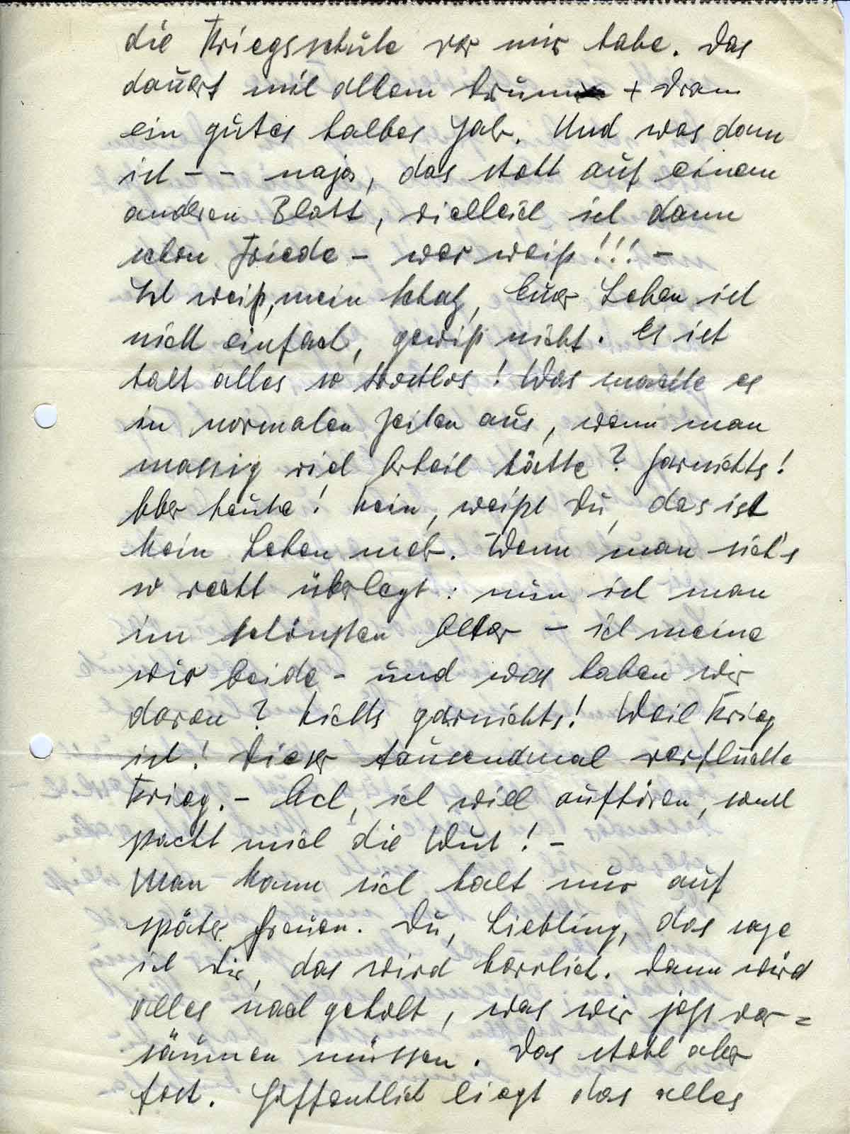 Ich weiß, mein Schatz, Euer Leben ist nicht einfach, gewiß nicht. Es ist halt alles so trostlos! Was machte es in normalen Zeiten aus, wenn man massig viel Arbeit hätte? Garnichts! Aber heute! Nein, weißt Du, das ist kein Leben mehr. Wenn man sich’s so recht überlegt: nun ist man im schönsten Alter - ich meine wir beide - und was haben wir davon? Nichts garnichts! Weil Krieg ist! Dieser tausendmal verfluchte Krieg. - Ach, ich will aufhören, sonst packt mich die Wut! -