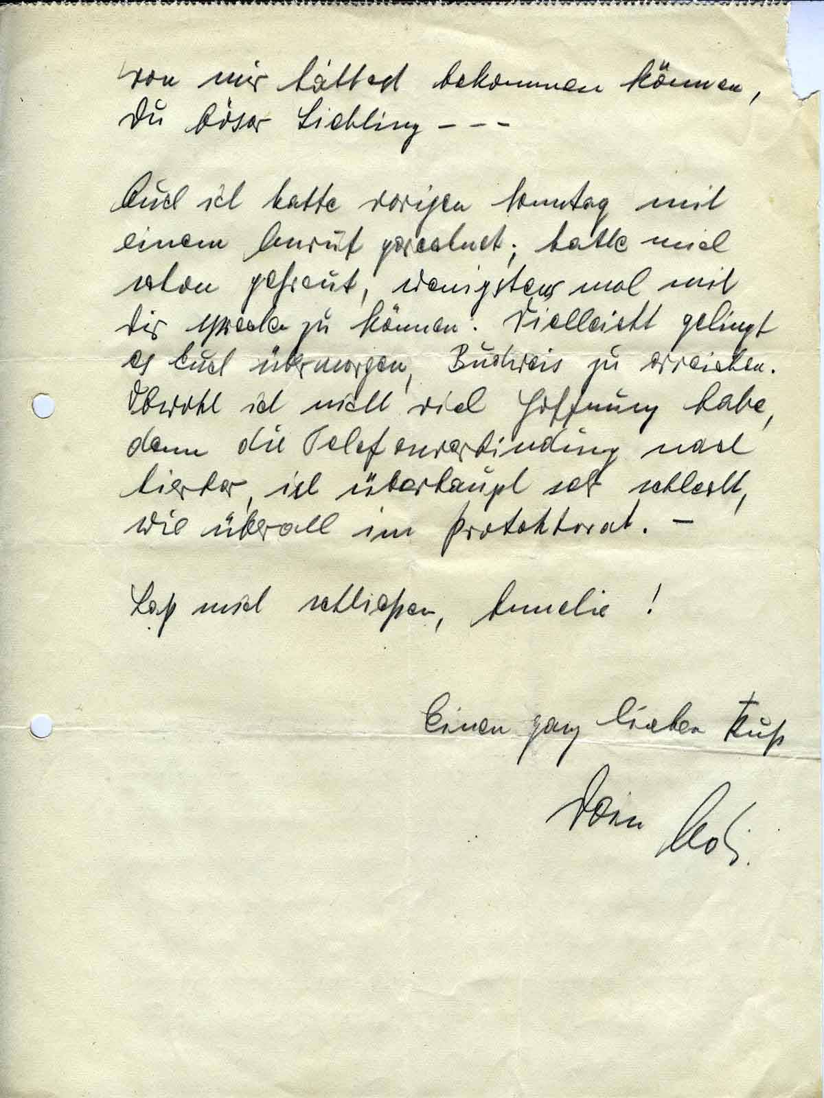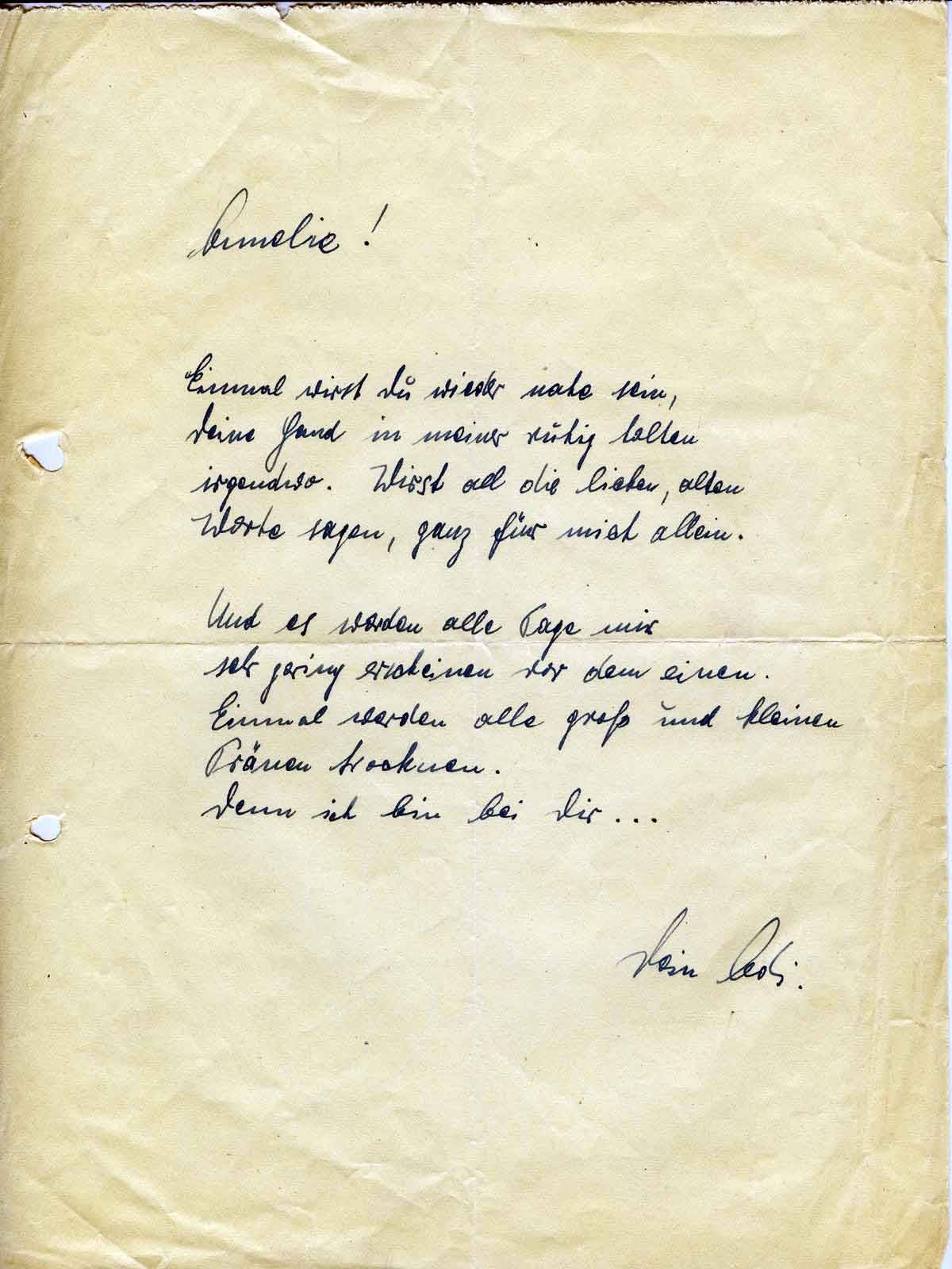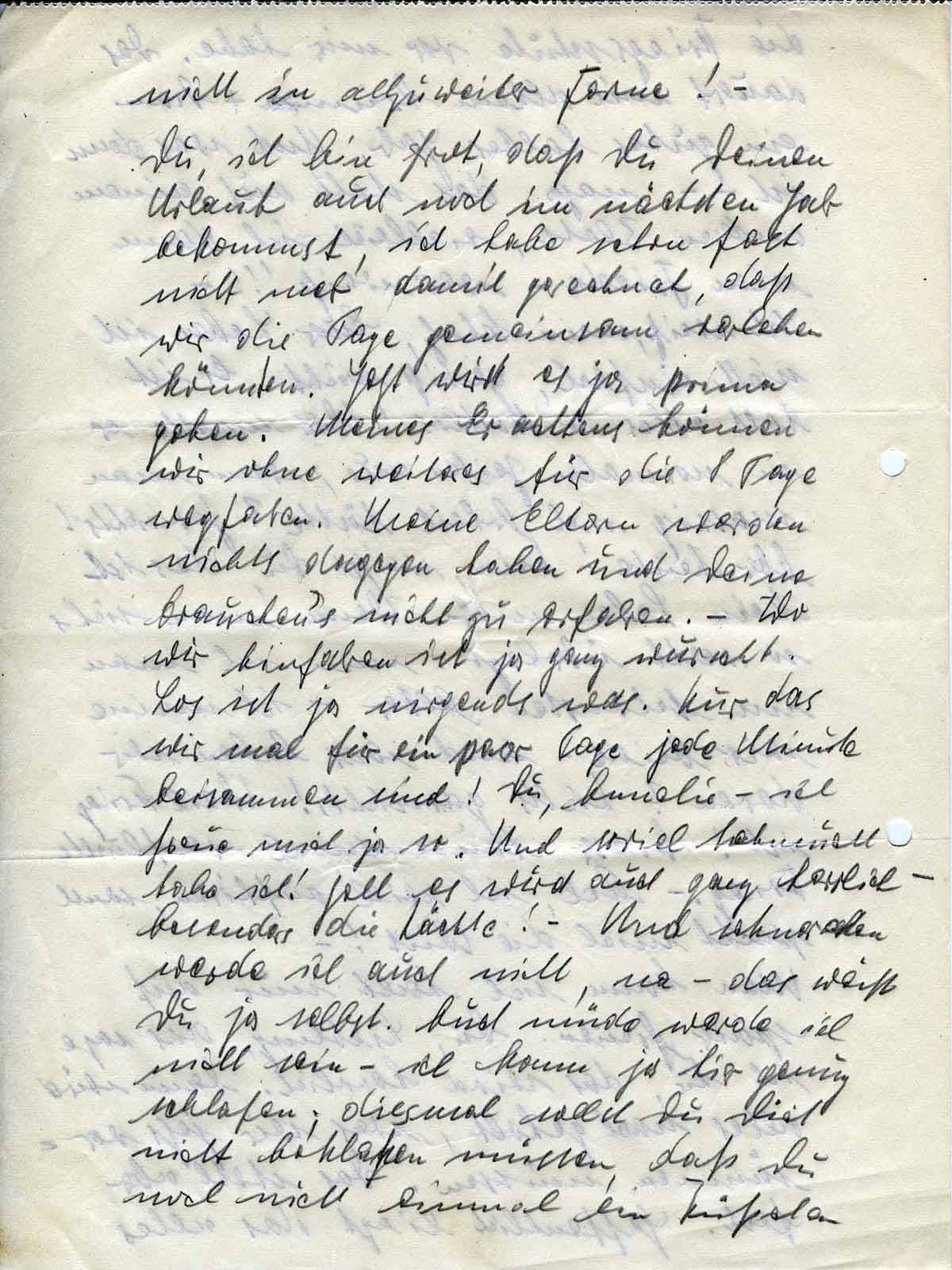 Du, ich bin froh, daß Du Deinen Urlaub auch noch im nächsten Jahr bekommst, ich habe schon fast nicht mehr damit gerechnet, daß wir die Tage gemeinsam verleben könnten. Jetzt wird es ja prima gehen. Meines Erachtens können wir ohne weiteres für die 8 Tage wegfahren. Meine Eltern werden nichts dagegen haben und Deine brauchen’s nicht zu erfahren. - Wo wir hinfahren ist ja ganz wurscht. Los ist ja nirgends was. Nur das wir mal für ein paar Tage jede Minute beisammen sind! Du, Annelie - ich freue mich ja so. Und soviel Sehnsucht habe ich! Gell, es wird auch ganz herrlich - besonders die Nächte! - Und schnarchen werde ich auch nicht, na - das weißt Du ja selbst. Auch müde werde ich nicht sein - ich kann ja hier genug schlafen; diesmal sollst Du Dich nicht beklagen müssen, daß Du noch nicht einmal ein Küßchen