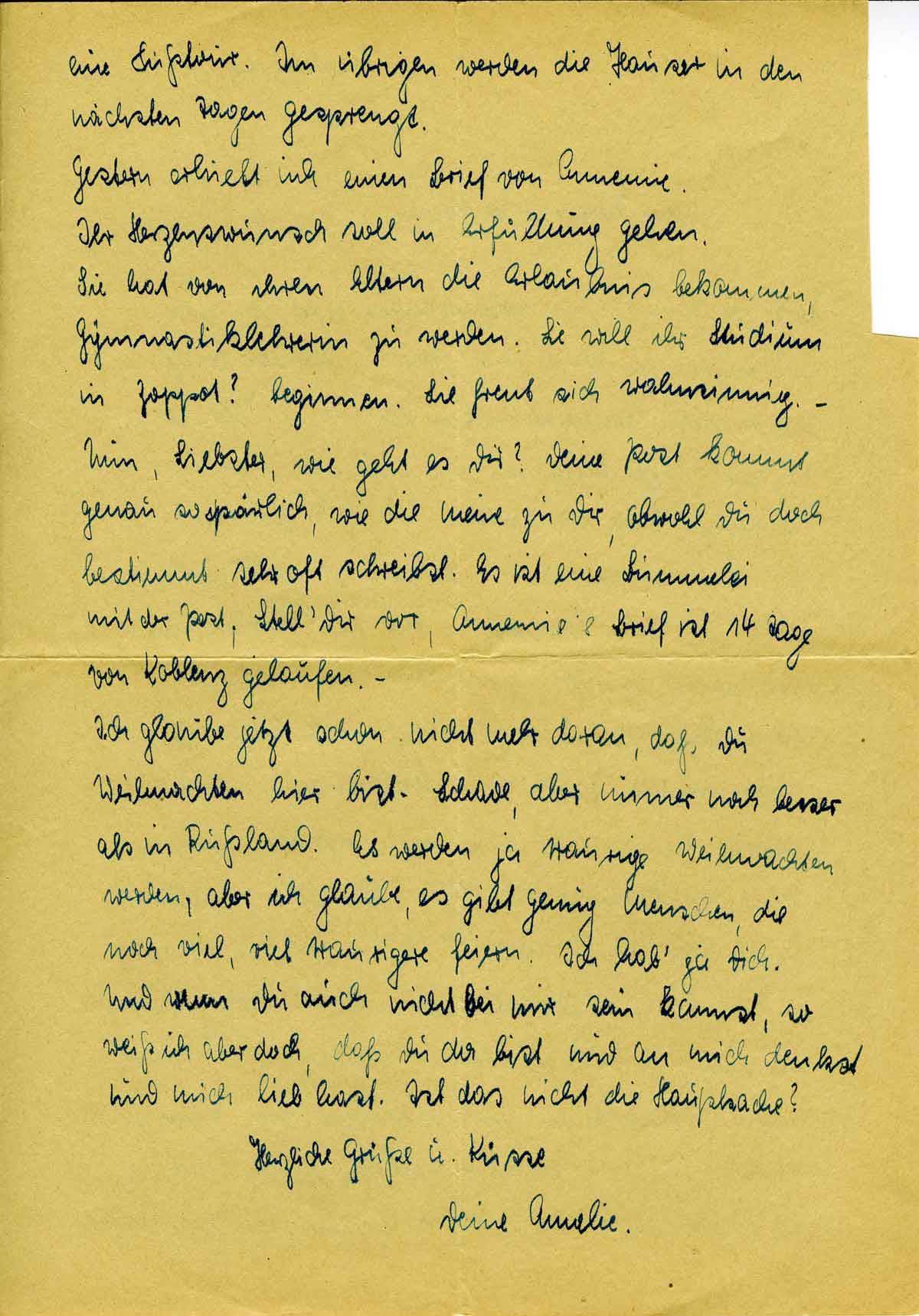 Ich glaube jetzt schon nicht mehr daran, daß Du Weihnachten hier bist. Schade, aber immer noch besser als in Rußland. Es werden ja traurige Weihnachten werden, aber ich glaube, es gibt genug Menschen, die noch viel, viel traurigere feiern. Ich hab’ ja Dich. Und wenn Du auch nicht bei mir sein kannst, so weiß ich aber doch, daß Du da bist und an mich denkst und mich lieb hast. Ist das nicht die Hauptsache?