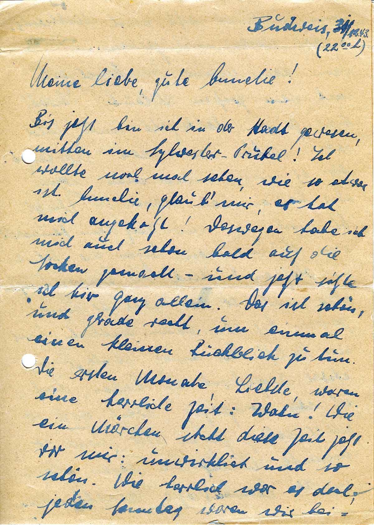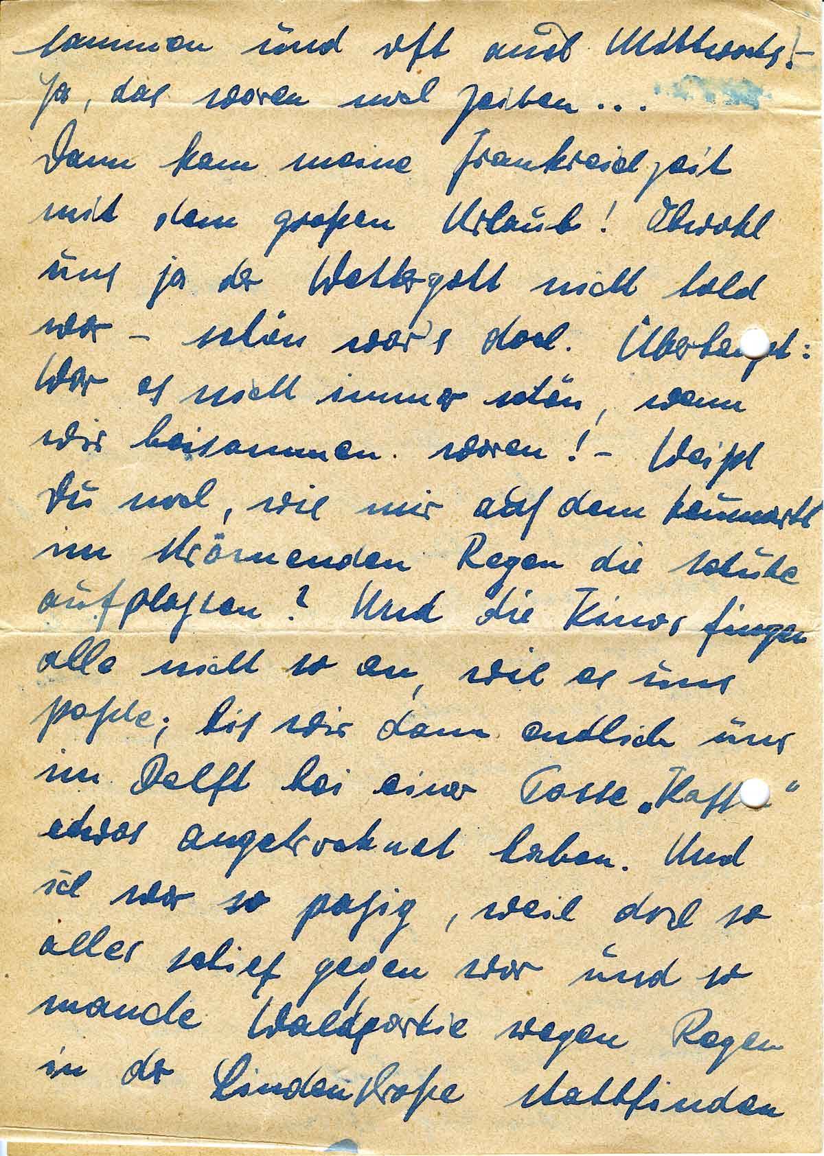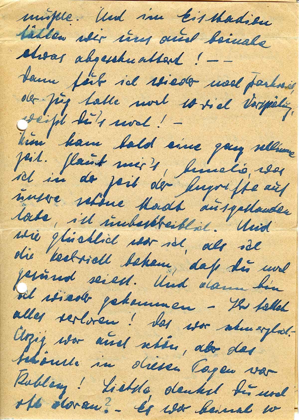 Nun kam bald eine ganz schlimme Zeit. Glaub mir’s, Annelie, was ich in der Zeit der Angriffe auf unsere schöne Stadt ausgestanden habe, ist unbeschreiblich. Und wie glücklich war ich, als ich die Nachricht bekam, daß Du noch gesund seiest. Und dann bin ich wieder gekommen - Ihr hattet alles verloren! Das war schmerzlich. - Ürzig war auch schön, aber das Schönste in diesen Tagen war Koblenz! Liebste, denkst Du noch oft daran? - Es war beinah so