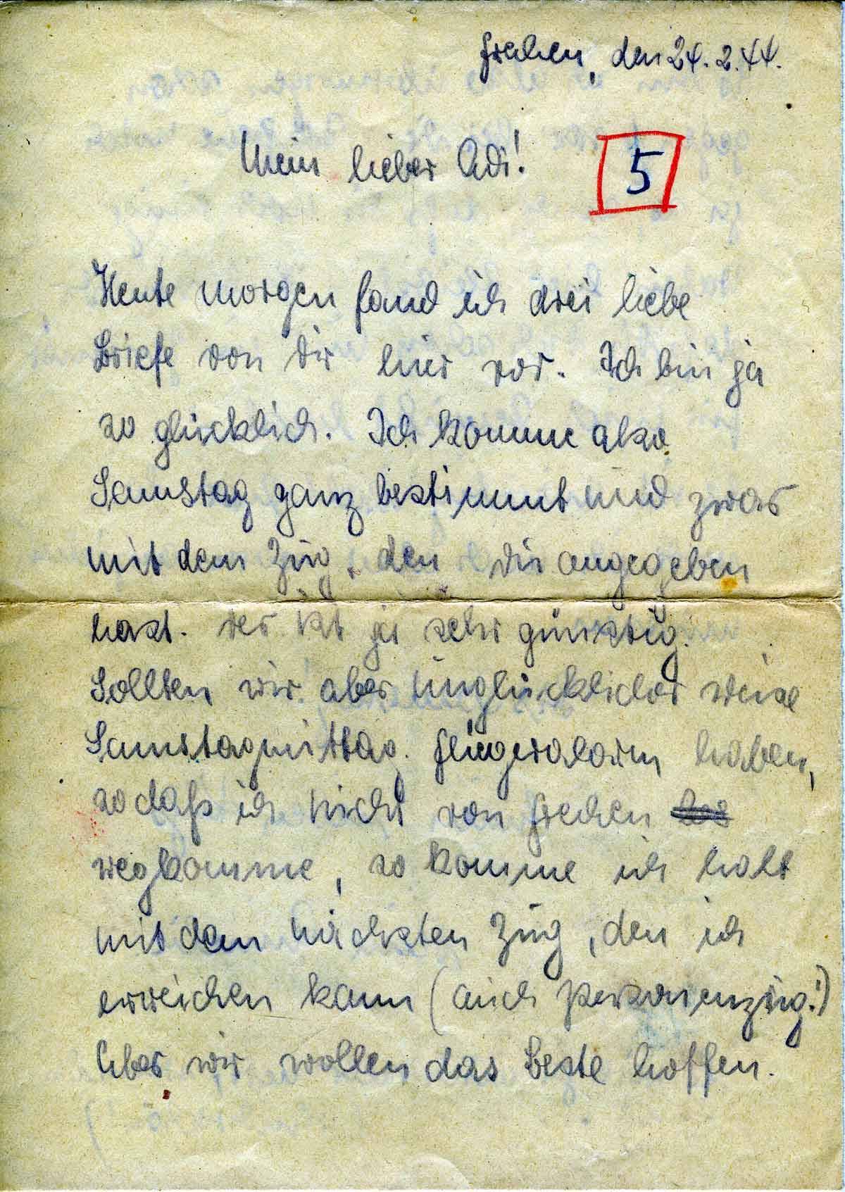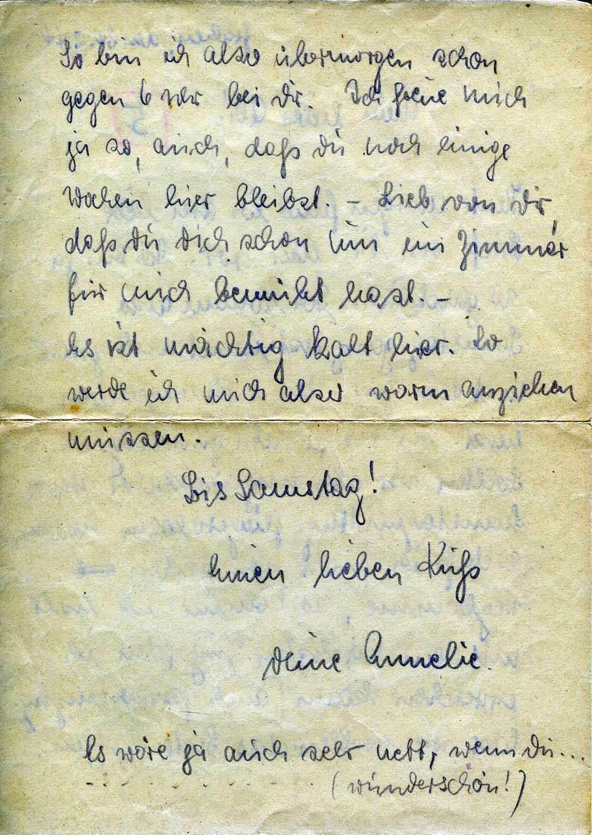 Heute morgen fand ich drei liebe Briefe von Dir hier vor. Ich bin ja so glücklich. Ich komme also Samstag ganz bestimmt und zwar mit dem Zug, den du angegeben hast. Der ist ja sehr günstig.