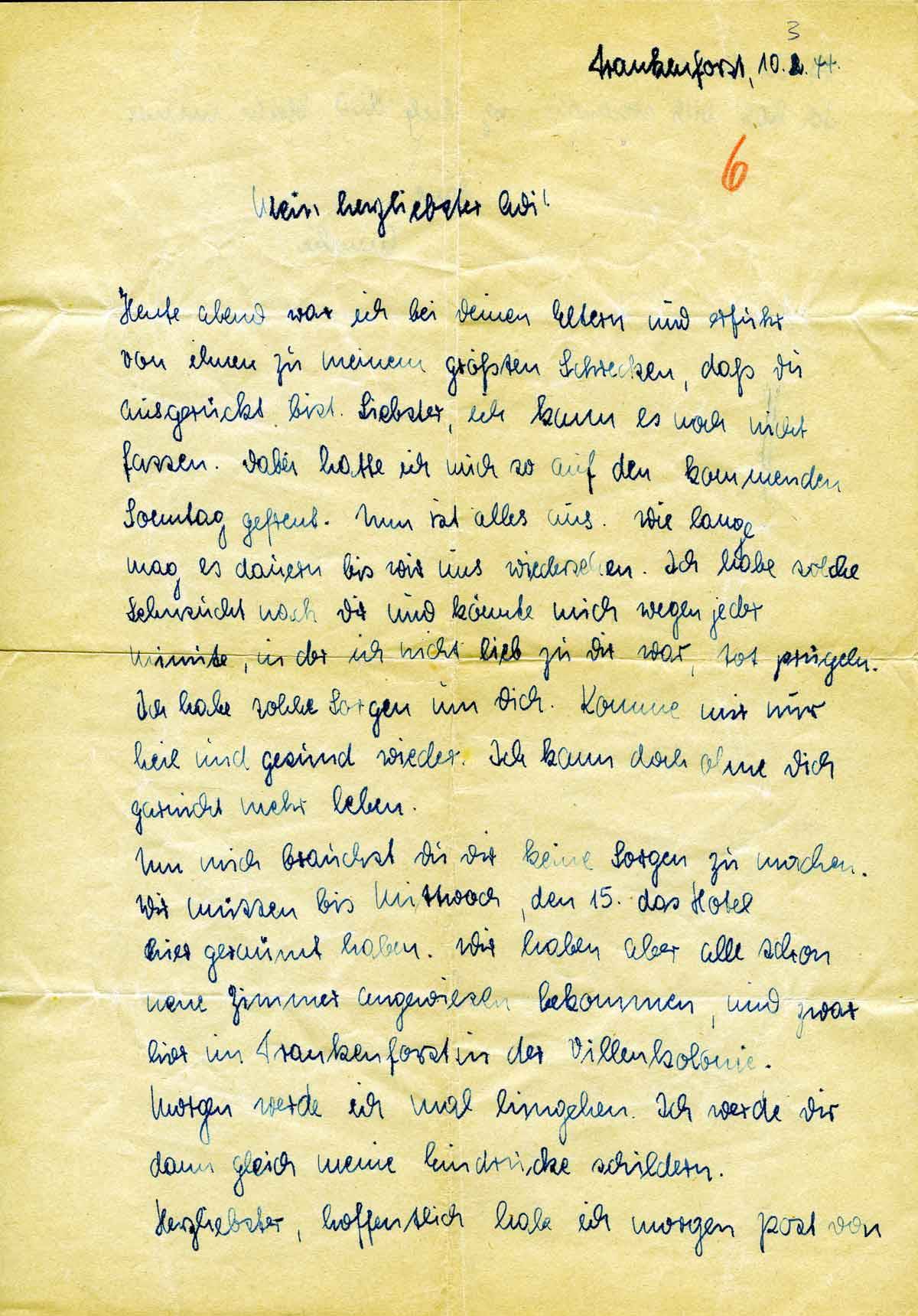 Heute abend war ich bei Deinen Eltern und erfuhr von ihnen zu meinem größten Schrecken, daß Du ausgerückt bist. Liebster, ich kann es noch nicht fassen. Dabei hatte ich mich so auf den kommenden Sonntag gefreut. Nun ist alles aus. Wie lange mag es dauern bis wir uns wiedersehen. Ich habe solche Sehnsucht nach Dir und könnte mich wegen jeder Minute, in der ich nicht lieb zu Dir war, tot prügeln. Ich habe solche Sorgen um Dich. Komme mir nur heil und gesund wieder. Ich kann doch ohne Dich garnicht mehr leben.