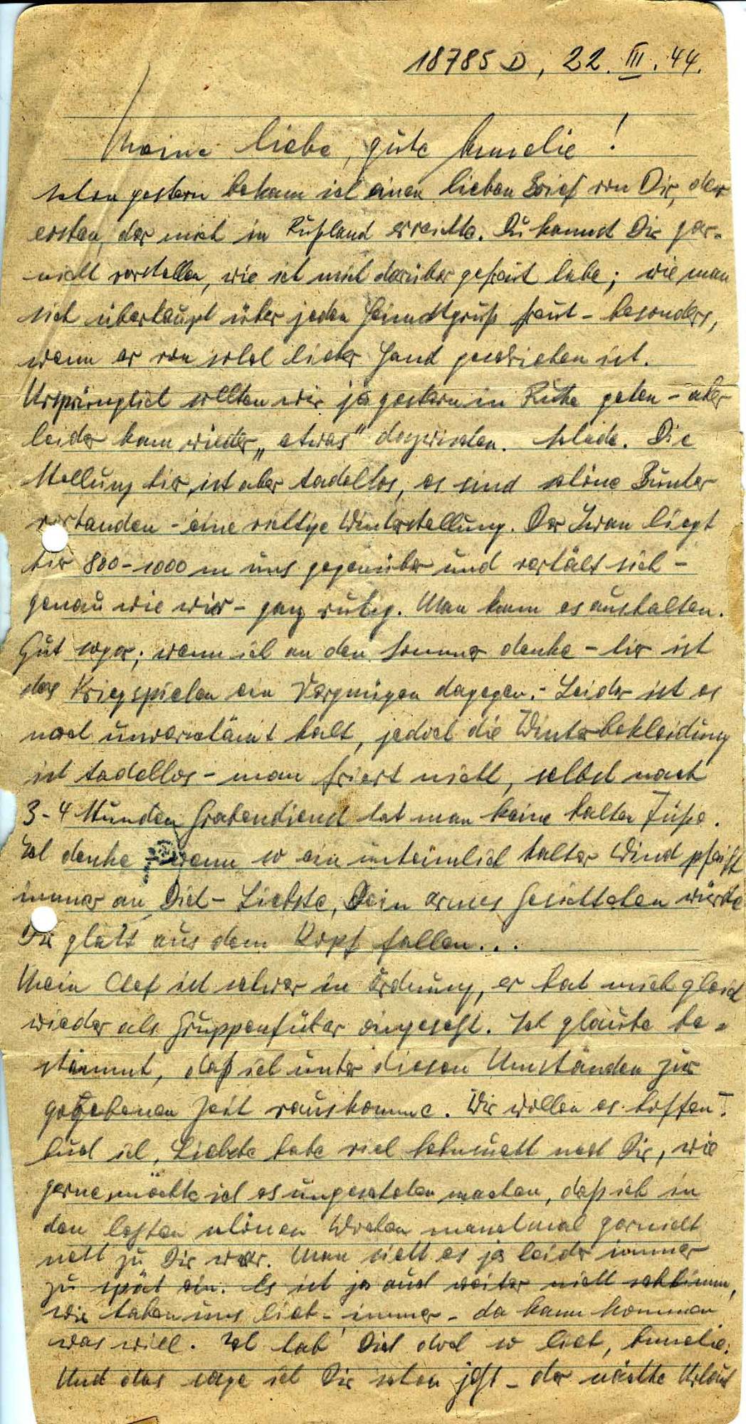 Ursprünglich sollten wir ja gestern in Ruhe gehen - aber leider kam wieder „etwas“ dazwischen. Schade. Die Stellung hier ist aber tadellos, es sind schöne Bunker vorhanden - eine richtige Winterstellung. Der Iwan liegt hier 800 - 1000 m uns gegenüber und verhält sich - genau wie wir - ganz ruhig. Man kann es aushalten. Gut sogar; wenn ich an den Sommer denke - hier ist das Krieg spielen ein Vergnügen dagegen. - Leider ist es noch unverschämt kalt, jedoch die Winterbekleidung ist tadellos - man friert nicht, selbst nach 3 - 4 Stunden Grabendienst hat man keine kalten Füße. Ich denke, wenn so ein unheimlich kalter Wind pfeift immer an Dich - Liebste, Dein armes Gesichtchen würde Dir glatt aus dem Kopf fallen ...