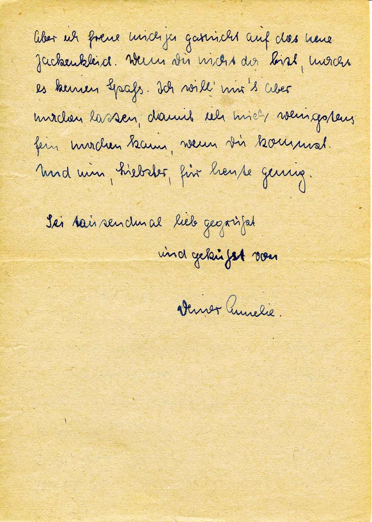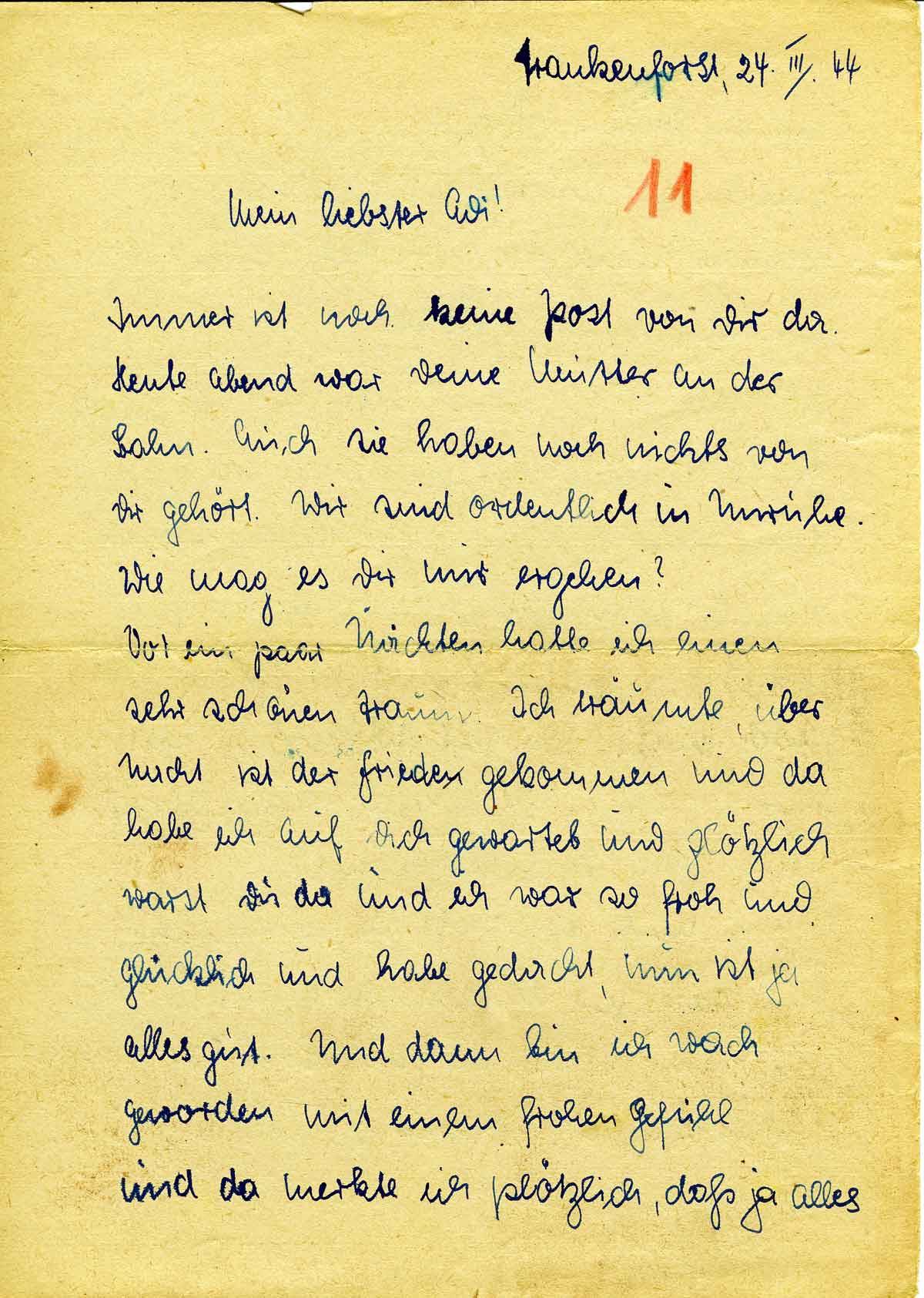 Immer ist noch keine Post von Dir da. Heute abend war Deine Mutter an der Bahn. Auch sie haben noch nichts von Dir gehört. Wir sind ordentlich in Unruhe. Wie mag es Dir nur ergehen?