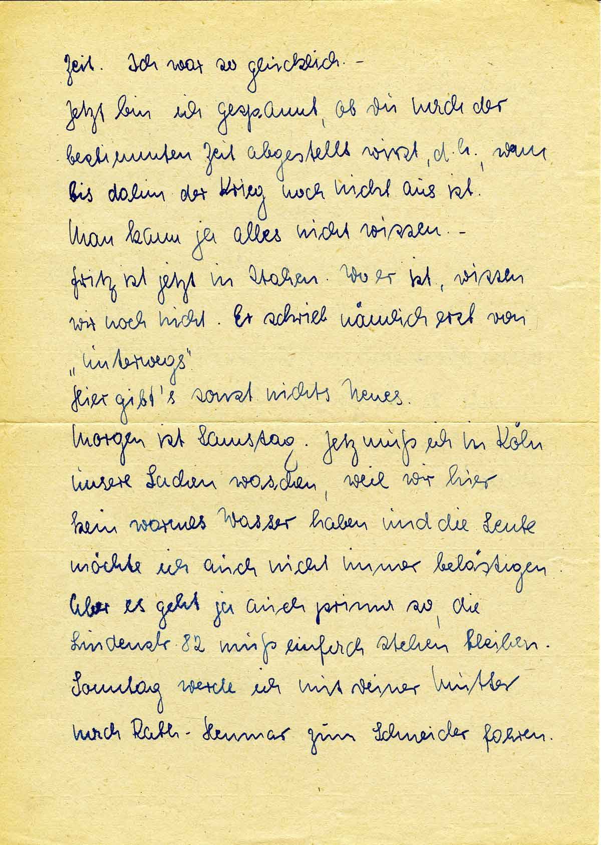 Morgen ist Samstag. Jetzt muß ich in Köln unsere Sachen waschen, weil wir hier kein warmes Wasser haben und die Leute möchte ich auch nicht immer belästigen. Aber es geht ja auch prima so, die Lindenstr. 82 muß einfach stehen bleiben. Sonntag werde ich mit Deiner Mutter nach Rath-Heumar zum Schneider fahren.