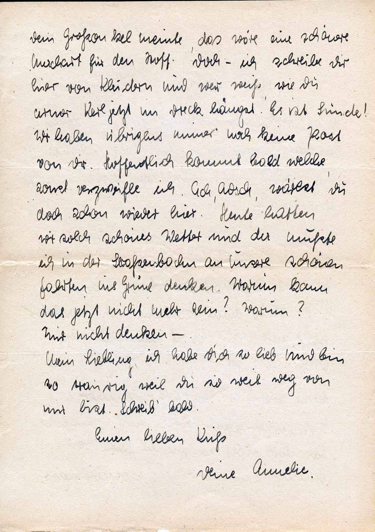 Mein Liebling, ich habe Dich so lieb und bin so traurig, weil Du so weit weg von mir bist. Schreib’ bald.
