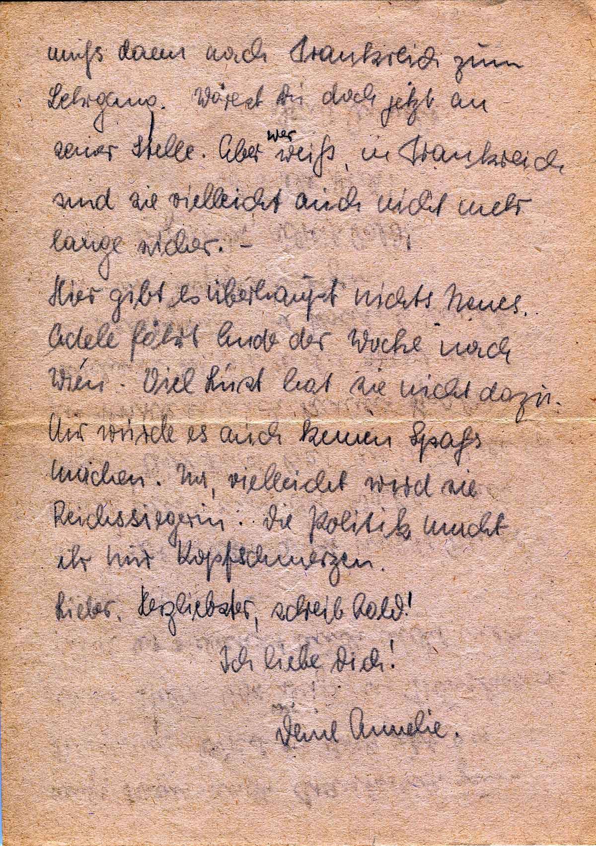 Immer ist noch keine Post von Dir da. Es ist Dir doch hoffentlich noch nichts zugestoßen. Ich habe solche Angst. Wärest Du doch endlich wieder hier. Mir kommt es wie eine Ewigkeit vor, seitdem Du weg bist. Ohne Dich ist das Leben garnicht schön. Lieber, lieber Adi, ich hab’ Dich doch so lieb. - Wann wird wohl die erste Post von Dir kommen? -