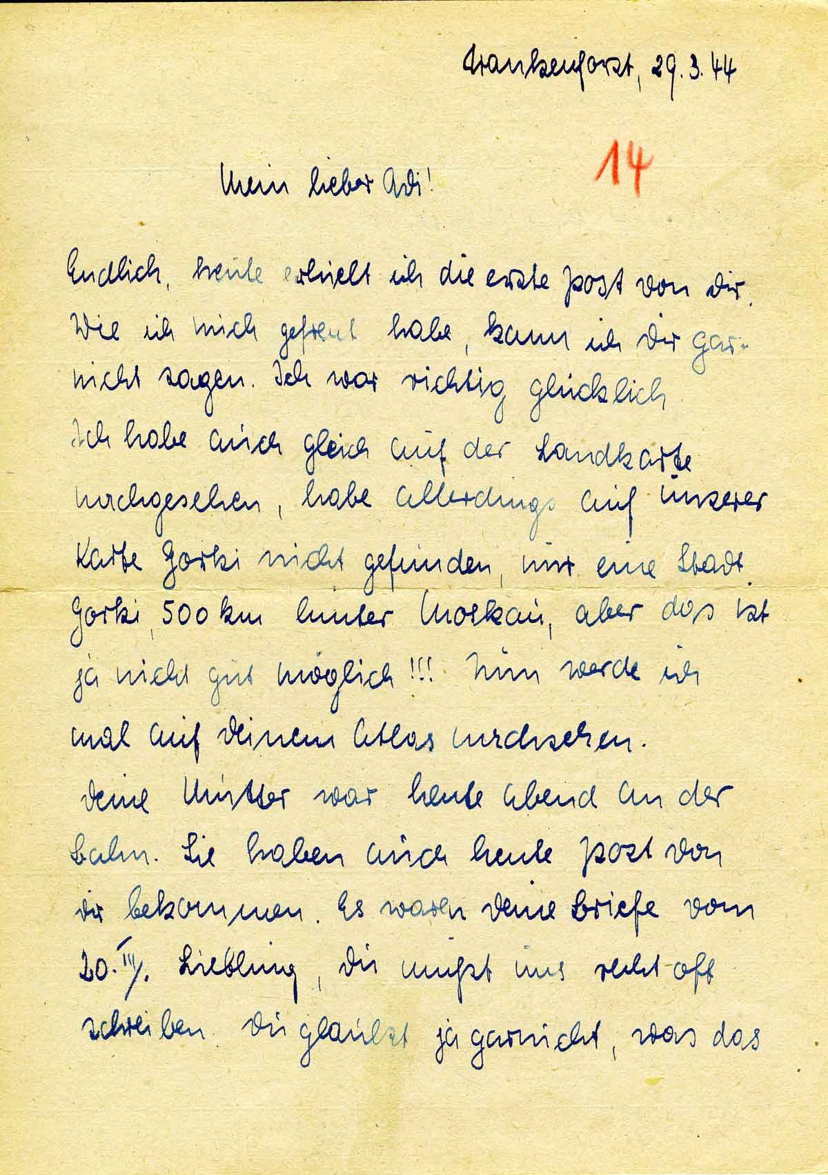 Endlich, heute erhielt ich die erste Post von Dir. Wie ich mich gefreut habe, kann ich Dir garnicht sagen. Ich war richtig glücklich. Ich habe auch gleich auf der Landkarte nachgesehen, habe allerdings auf unserer Karte Gorki nicht gefunden, nur eine Stadt Gorki, 500 km hinter Moskau, aber das ist ja nicht gut möglich!!! Nun werde ich mal auf Deinem Atlas nachsehen.