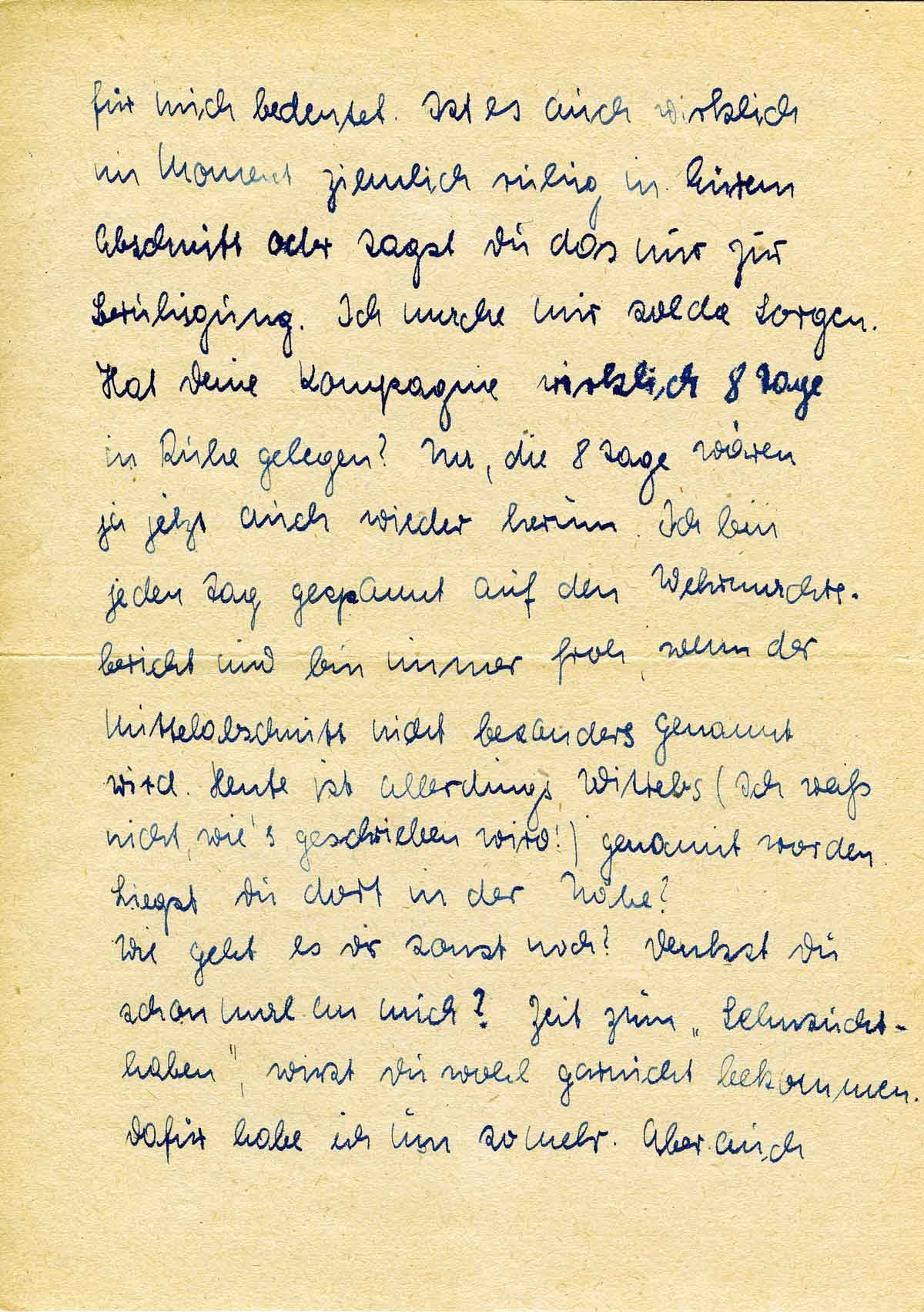 für mich bedeutet. Ist es auch wirklich im Moment ziemlich ruhig in Eurem Abschnitt oder sagst Du das nur zur Beruhigung. Ich mache mir solche Sorgen. Hat Deine Kompagnie wirklich 8 Tage in Ruhe gelegen? Na, die 8 Tage wären ja jetzt auch wieder herum. Ich bin jeden Tag gespannt auf den Wehrmachtsbericht und bin immer froh, wenn der Mittelabschnitt nicht besonders genannt wird. Heute ist allerdings Wittebs (Ich weiß nicht, wie’s geschrieben wird!) genannt worden. Liegst Du dort in der Nähe?