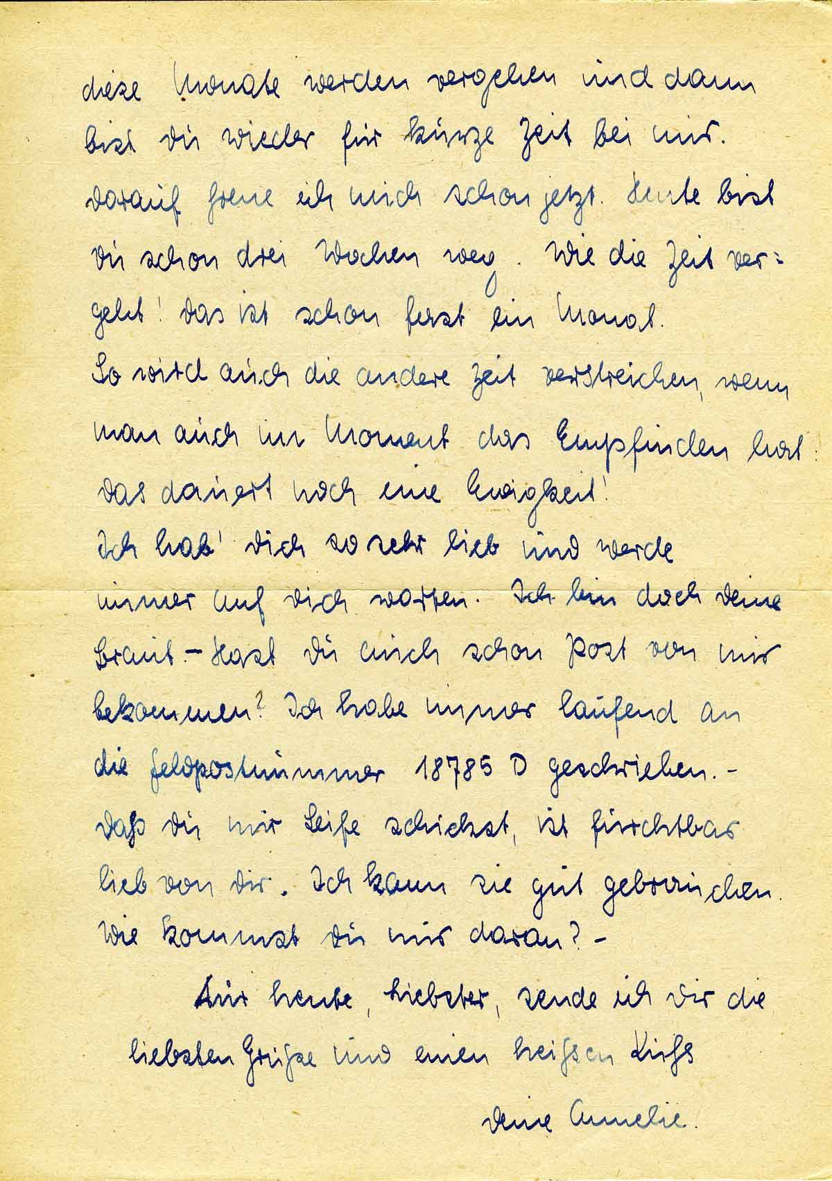 Ich hab’ Dich so sehr lieb und werde immer auf Dich warten. Ich bin doch Deine Braut. - Hast Du auch schon Post von mir bekommen? Ich habe immer laufend an die Feldpostnummer 18785 D geschrieben. - Daß Du mir Seife schickst, ist furchtbar lieb von Dir. Ich kann sie gut gebrauchen. Wie kommst Du nur daran? -