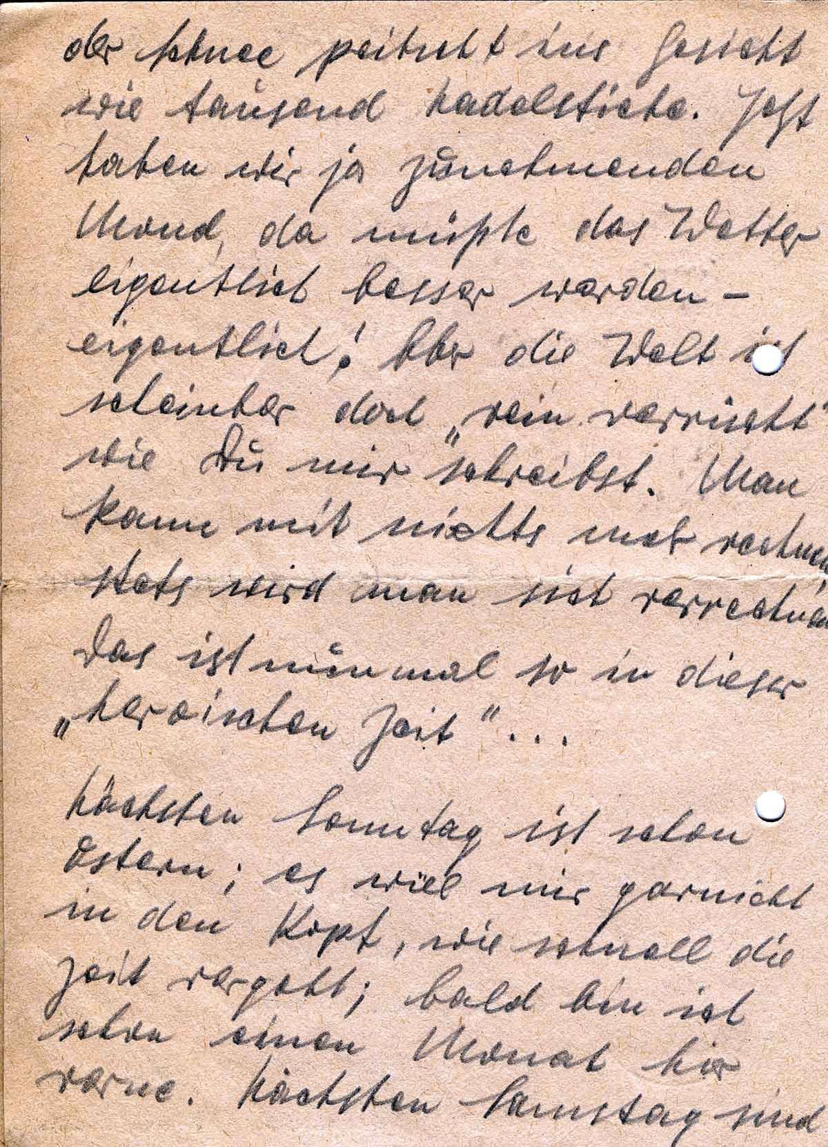 Nun sind bald die schönen Ruhetage zu Ende, übermorgen gehen wir wieder in Stellung. Es ist ja immer so: schöne Tage gehen viel zu schnell zu Ende - leider! Es ist ja weiter nicht wichtig; vorne ist ja alles ruhig. Nur das Wetter ist seit gestern wieder unheimlich. Es stürmt und schneit ganz toll. Im Bunker ist man ja davor geschützt und die paar Stunden, die man draußen verbringen muß, gehen auch vorbei.