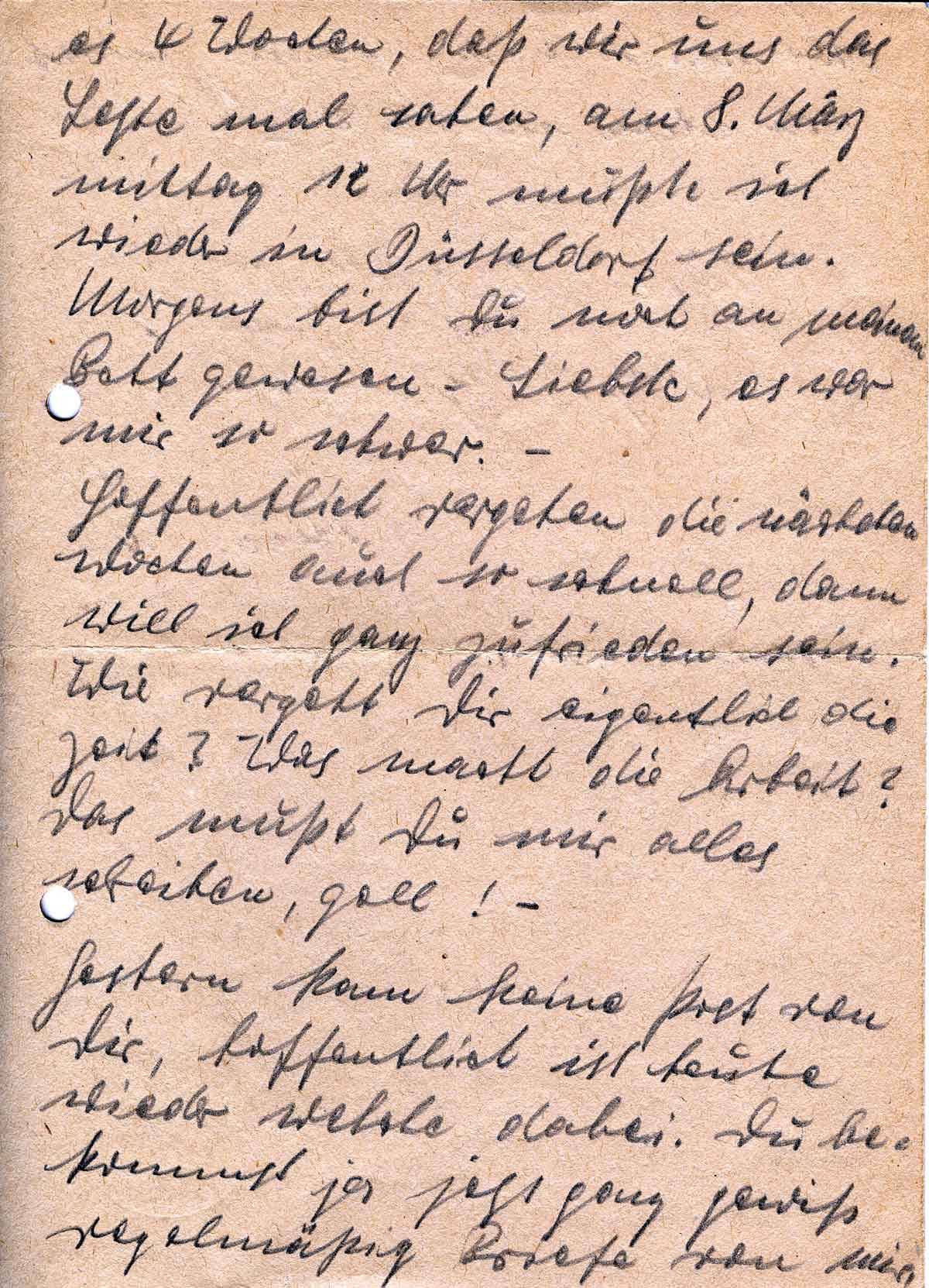 es 4 Wochen, daß wir uns das Letzte mal sahen, am 8. März mittag 12 Uhr mußte ich wieder in Düsseldorf sein. Morgens bist Du noch an meinem Bett gewesen - Liebste, es war mir so schwer. -