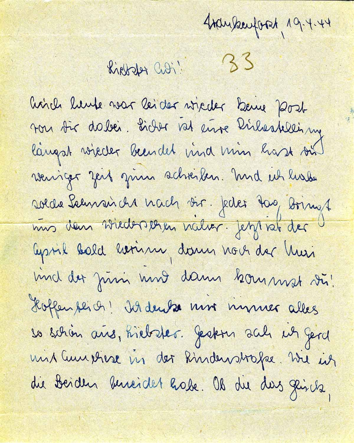 Auch heute war leider wieder keine Post von Dir dabei. Sicher ist eure Ruhestellung längst wieder beendet und nun hast Du weniger Zeit zum schreiben. Und ich habe solche Sehnsucht nach Dir. Jeder Tag bringt uns dem Wiedersehen näher. Jetzt ist der April bald herum, dann noch der Mai und der Juni und dann kommst Du! Hoffentlich! Ich denke mir immer alles so schön aus, Liebster. Gestern sah ich Gerd mit Anneliese in der Lindenstraße. Wie ich die Beiden beneidet habe. Ob die das Glück,