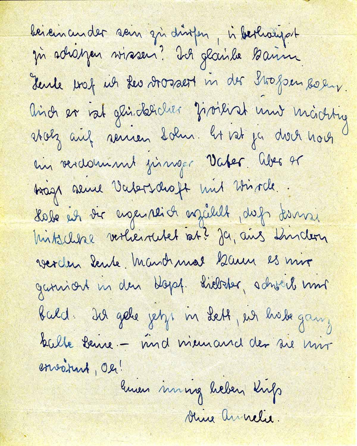 Habe ich Dir eigentlich erzählt, daß Hansi Mitschke verheiratet ist? Ja, aus Kindern werden Leute. Manchmal kann es mir garnicht in den Kopf. Liebster, schreib mir bald. Ich gehe jetzt in Bett, ich habe ganz kalte Beine - und niemand der sie mir erwärmt, oh!