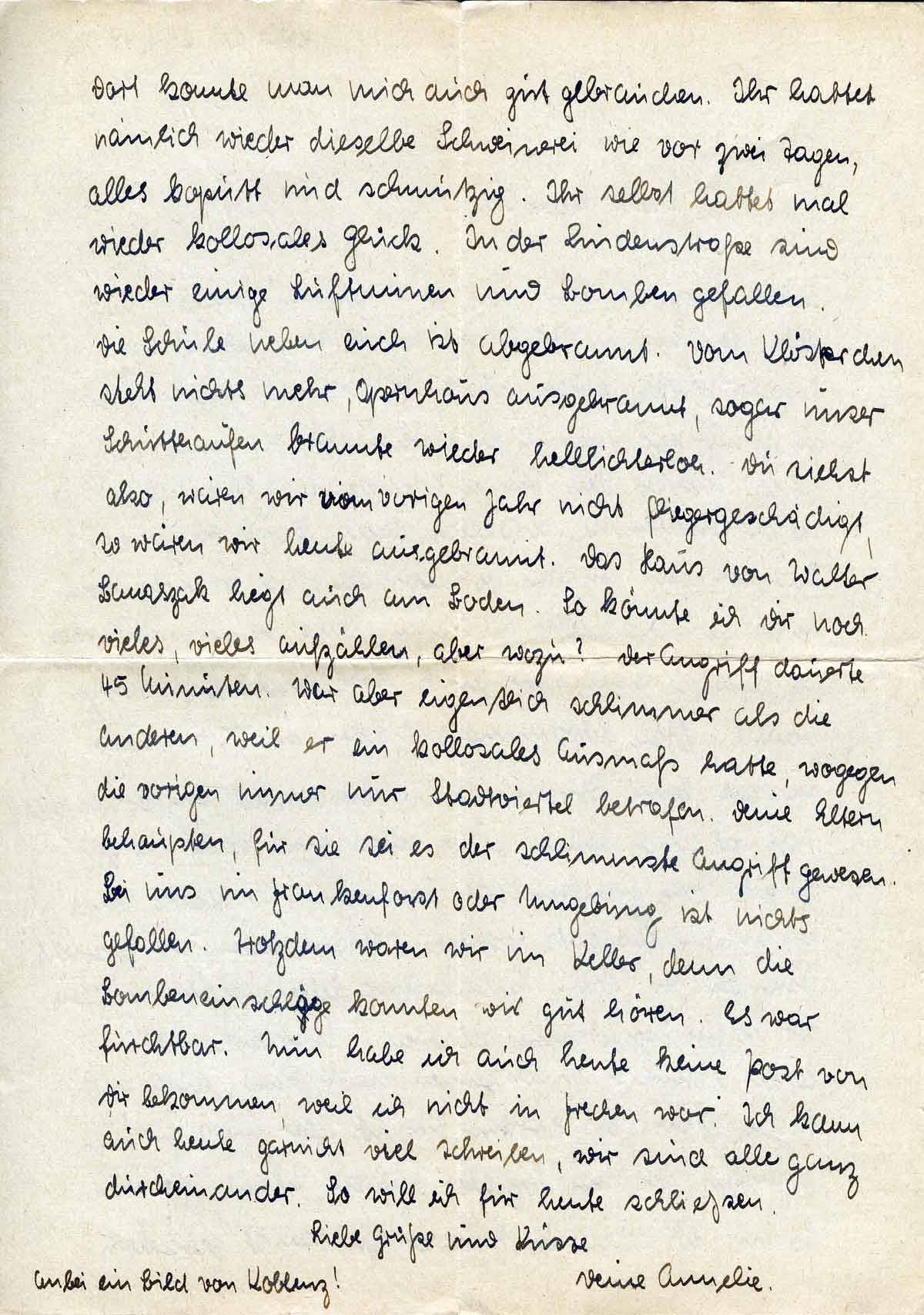 Dort konnte man mich auch gut gebrauchen. Ihr hattet nämlich wieder dieselbe Schweinerei wie vor zwei Tagen, alles kaputt und schmutzig. Ihr selbst hattet mal wieder kollosales Glück. In der Lindenstraße sind wieder einige Luftminen und Bomben gefallen. Die Schule neben euch ist abgebrannt. Vom Klösterchen steht nichts mehr, Opernhaus ausgebrannt, sogar unser Schutthaufen brannte wieder helllichterloh. - Du siehst also, wären wir vom vorigen Jahr nicht fliegergeschädigt, so wären wir heute ausgebrannt. Das Haus von Walter Lanaszak liegt auch am Boden. So könnte ich Dir noch vieles, vieles aufzählen, aber wozu? Der Angriff dauerte 45 Minuten. War aber eigentlich schlimmer als die anderen, weil er ein kollosales Ausmaß hatte, wogegen die vorigen immer nur Stadtviertel betrafen. Deine Eltern behaupten, für sie sei es der schlimmste Angriff gewesen. Bei uns im Frankenforst oder Umgebung ist nichts gefallen. Trotzdem waren wir im Keller, denn die Bombeneinschläge konnten wir gut hören. Es war furchtbar. Nun habe ich auch heute keine Post von Dir bekommen, weil ich nicht in Frechen war. Ich kann auch heute garnicht viel schreiben, wir sind alle ganz durcheinander. So will ich für heute schließen.