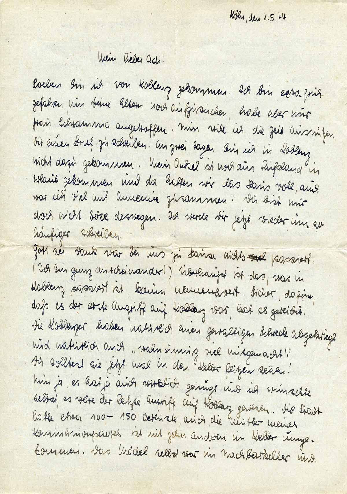 Gott sei Dank war bei uns zu Hause nichts passiert. (Ich bin ganz durcheinander!) Überhaupt ist das, was in Koblenz passiert ist, kaum nennenswert. Sicher, dafür, daß es der erste Angriff auf Koblenz war, hat es gereicht. Die Koblenzer haben natürlich einen gewaltigen Schreck abgekriegt und natürlich auch „wahnsinnig viel mitgemacht!“ Du solltest sie jetzt mal in den Keller flitzen sehen!