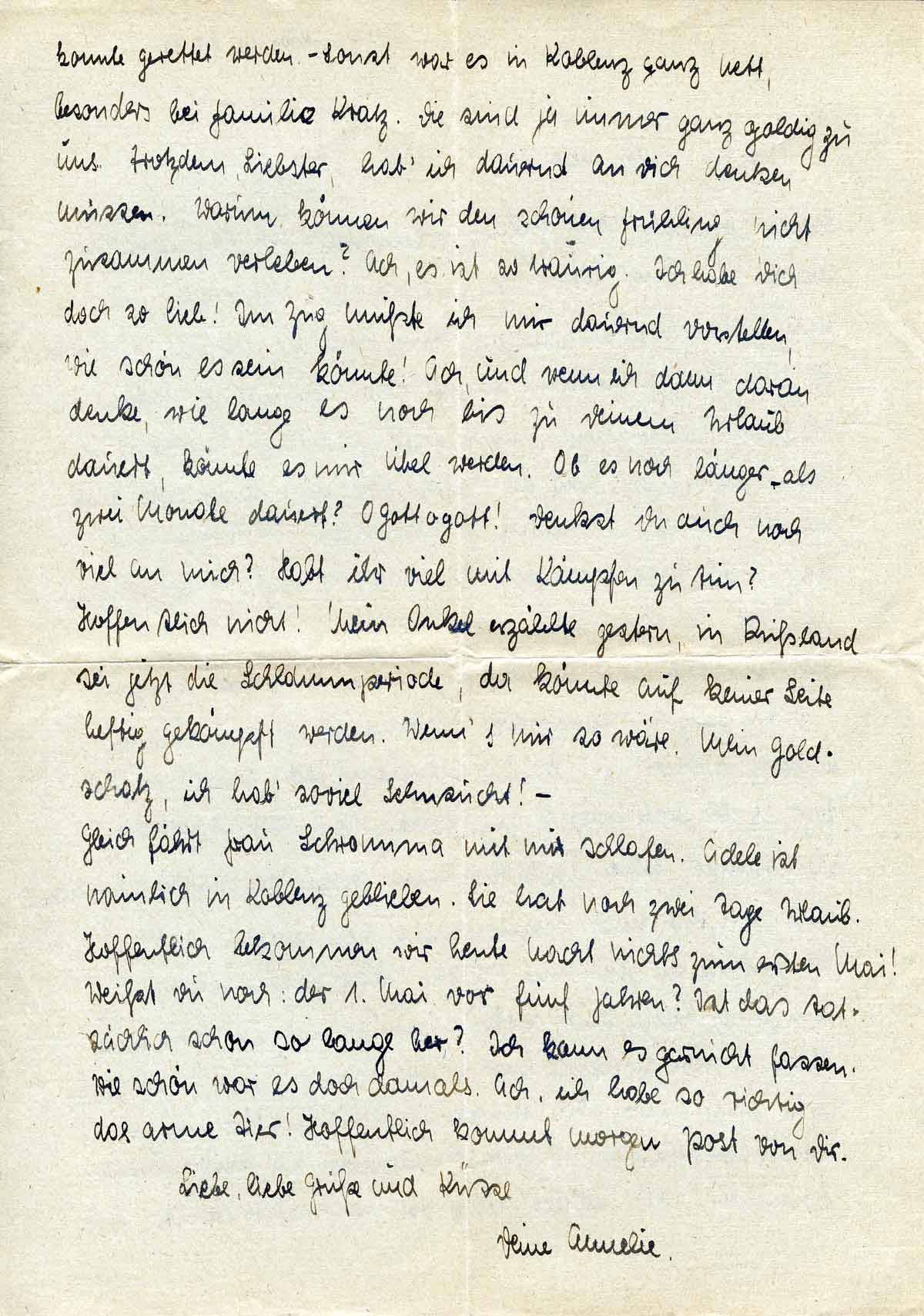 konnte gerettet werden. - Sonst war es in Koblenz ganz nett, besonders bei Familie Kratz. Sie sind ja immer ganz goldig zu uns. Trotzdem, Liebster, hab’ ich dauernd an Dich denken müssen. Warum können wir den schönen Frühling nicht zusammen verleben? Ach, es ist so traurig. Ich habe Dich doch so lieb! Im Zug mußte ich mir dauernd vorstellen, wie schön es sein könnte! Ach, und wenn ich dann daran denke, wie lange es noch bis zu Deinem Urlaub dauert, könnte es mir übel werden. Ob es noch länger als zwei Monate dauert? O Gott o gott! Denkst Du auch noch viel an mich? Habt ihr viel mit Kämpfen zu tun? Hoffentlich nicht! Mein Onkel erzählte gestern, in Rußland sei jetzt die Schlammperiode, da könnte auf keiner Seite heftig gekämpft werden. Wenn’s nur so wäre. Mein Goldschatz, ich hab’ soviel Sehnsucht! -