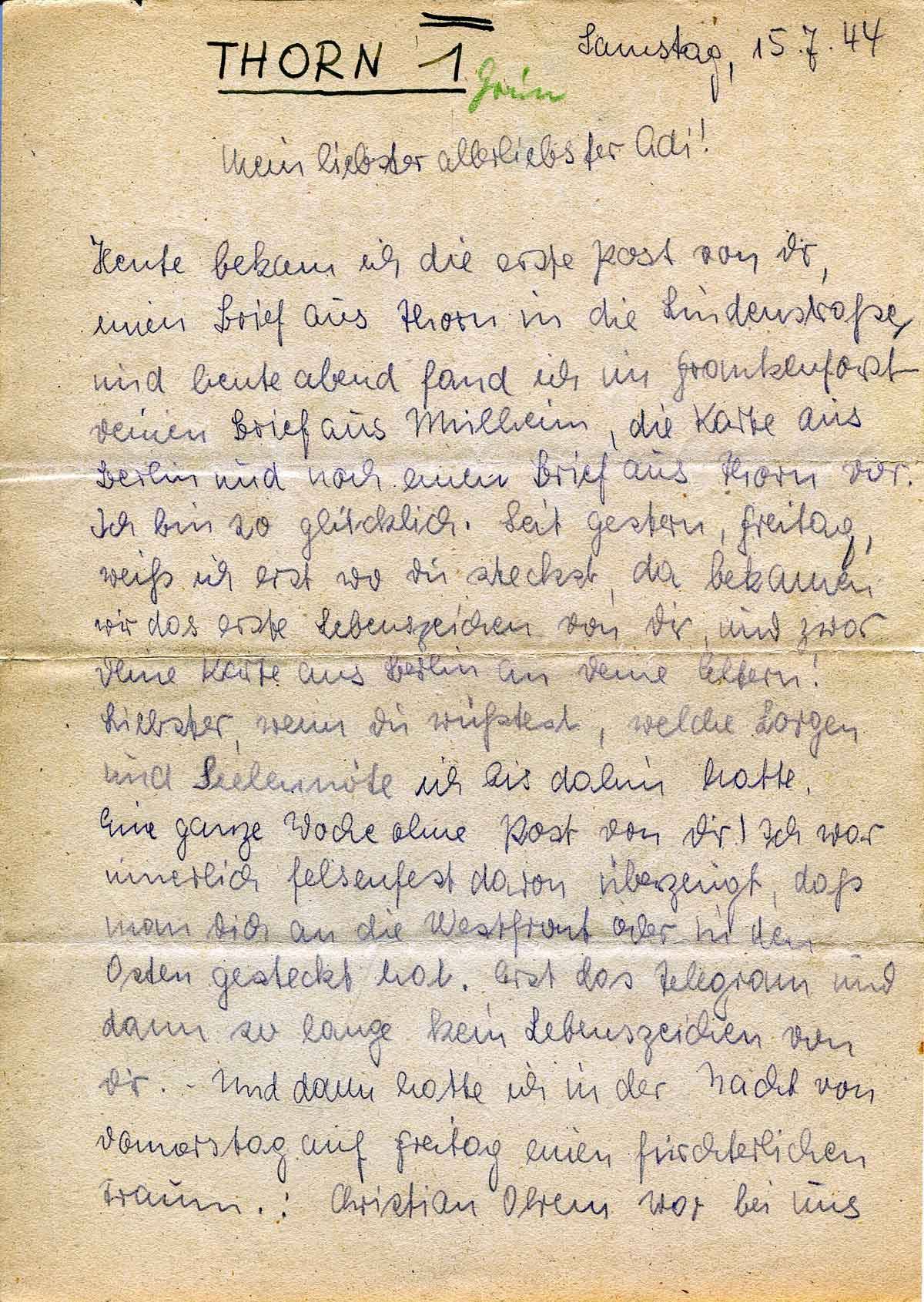 Heute bekam ich die erste Post von Dir, einen Brief aus Thorn in die Lindenstraße, und heute abend fand ich im Frankenforst Deinen Brief aus Mülheim, die Karte aus Berlin und noch einen Brief aus Thorn vor. Ich bin so glücklich. Seit gestern, Freitag, weiß ich erst wo Du steckst, da bekamen wir das erste Lebenszeichen von Dir, und zwar Deine Karte aus Berlin an Deine Eltern!