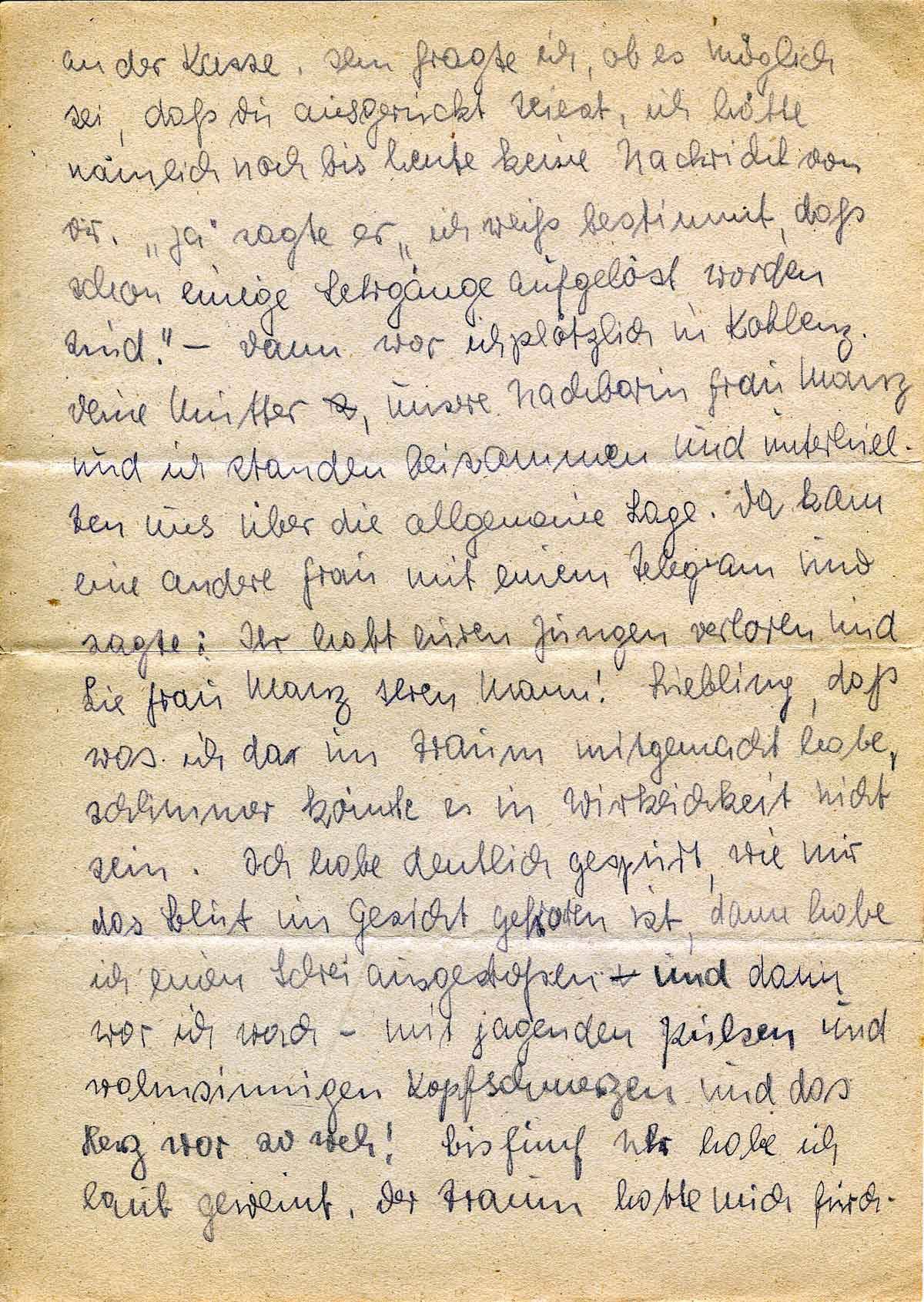 an der Kasse. Ihn fragte ich, ob es möglich sei, daß Du ausgerückt seiest, ich hätte nämlich noch bis heute keine Nachricht von Dir. „Ja“ sagte er „ich weiß bestimmt, daß schon einige Lehrgänge aufgelöst worden sind.“ - Dann war ich plötzlich in Koblenz. Deine Mutter, unsere Nachbarin Frau Manz und ich standen beisammen und unterhielten uns über die allgemeine Lage. Da kam eine andere Frau mit einem Telegram und sagte: Ihr habt euren Jungen verloren und Sie Frau Manz Ihren Mann! Liebling, daß was ich da im Traum mitgemacht habe, schlimmer könnte es in Wirklichkeit nicht sein. Ich habe deutlich gespürt, wie mir das Blut im Gesicht gefroren ist, dann habe ich einen Schrei ausgestoßen - und dann war ich wach - mit jagenden Pulsen und wahnsinnigen Kopfschmerzen und das Herz war so weh! Bis fünf Uhr habe ich laut geweint. Der Traum hatte mich fürch-