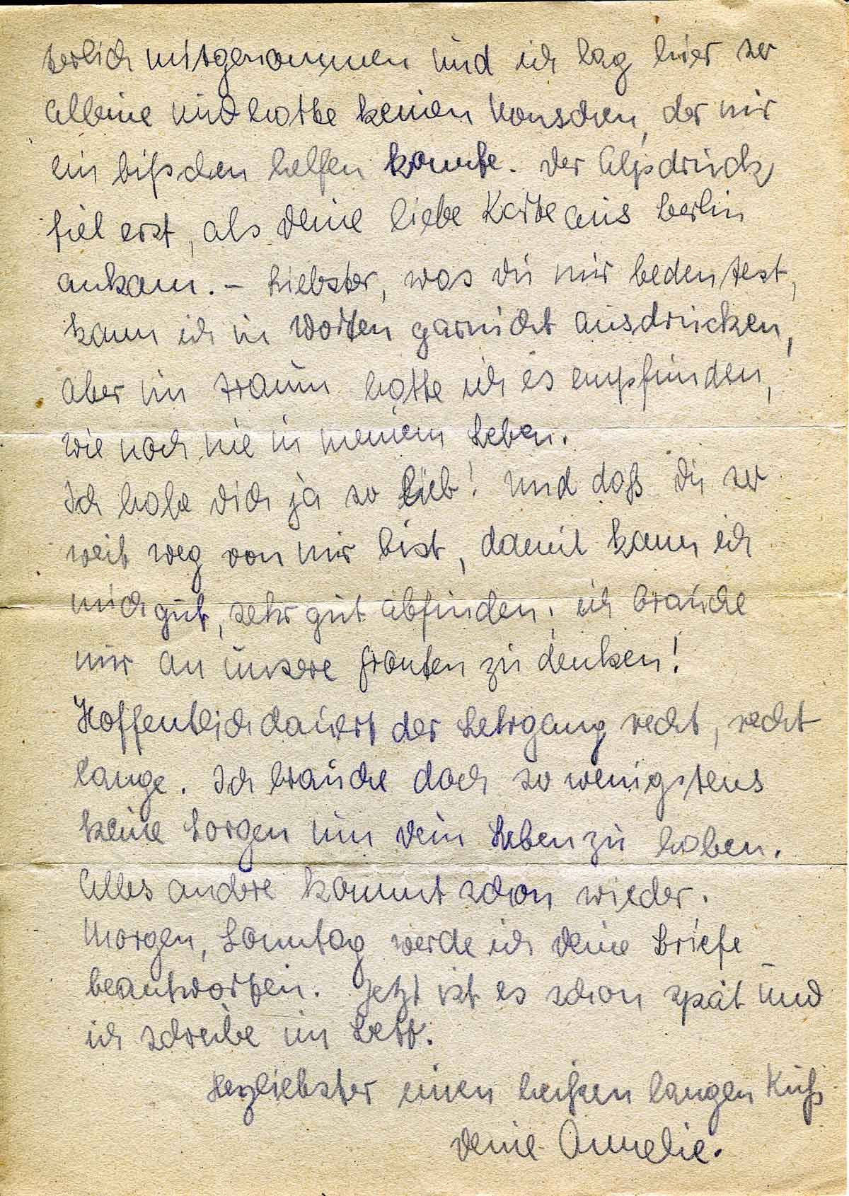 terlich mitgenommen und ich lag hier so alleine und hatte keinen Menschen, der mir ein bißchen helfen konnte. Der Alpdruck fiel erst, als Deine liebe Karte aus Berlin ankam. - Liebster, was Du mir bedeutest, kann ich in Worten garnicht ausdrücken, aber im Traum hatte ich es empfunden, wie noch nie in meinem Leben.