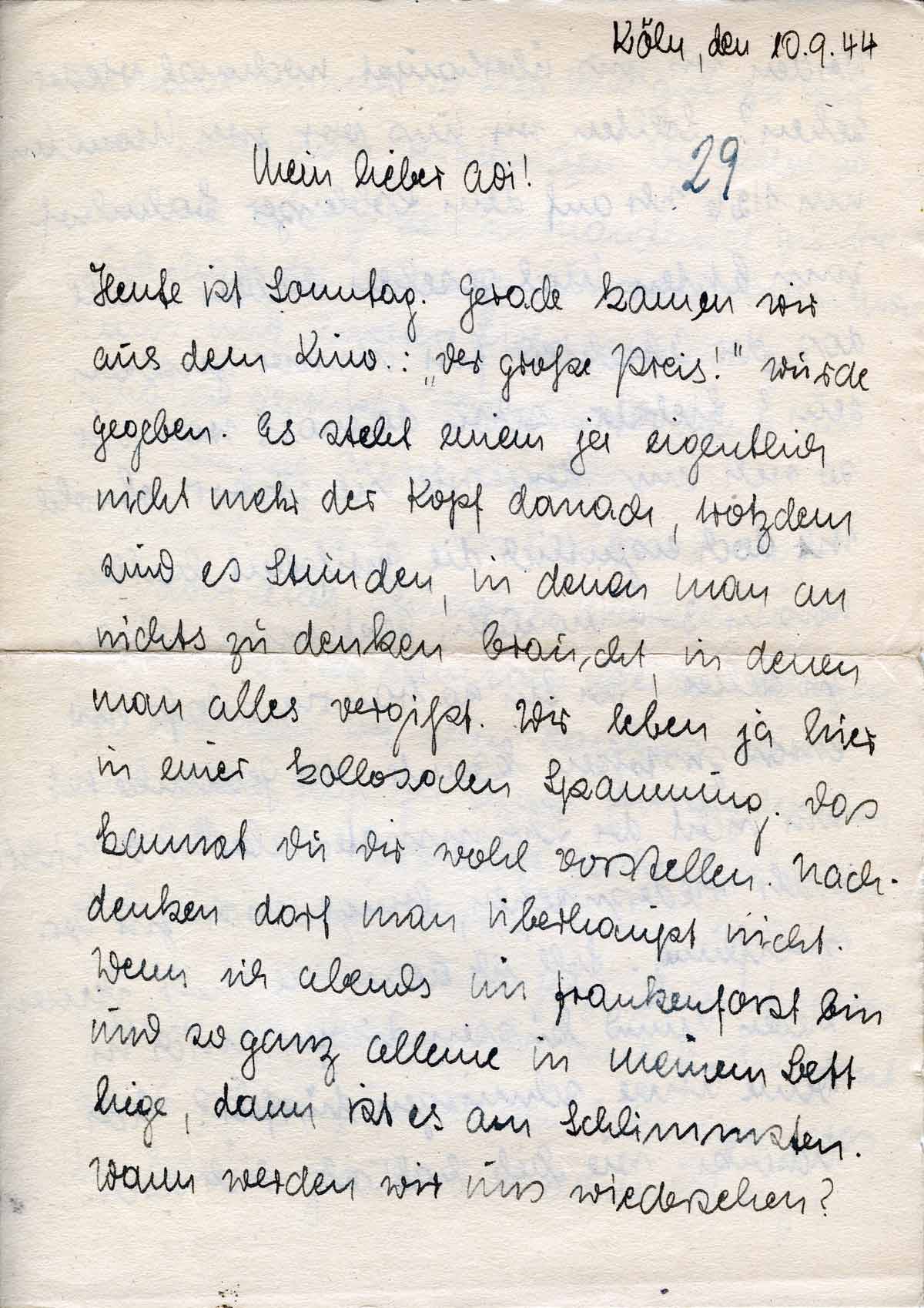 Heute ist Sonntag. Gerade kamen wir aus dem Kino: „Der große Preis!“ wurde gegeben. Es steht einem ja eigentlich nicht mehr der Kopf danach, trotzdem sind es Stunden, in denen man an nichts zu denken braucht, in denen man alles vergißt. Wir leben ja hier in einer kollosalen Spannung. Das kannst Du Dir wohl vorstellen. Nachdenken darf man überhaupt nicht. Wenn ich abends im Frankenforst bin und so ganz alleine in meinem Bett liege, dann ist es am Schlimmsten. Wann werden wir uns wiedersehen? Werden wir uns überhaupt nochmal wiedersehen?